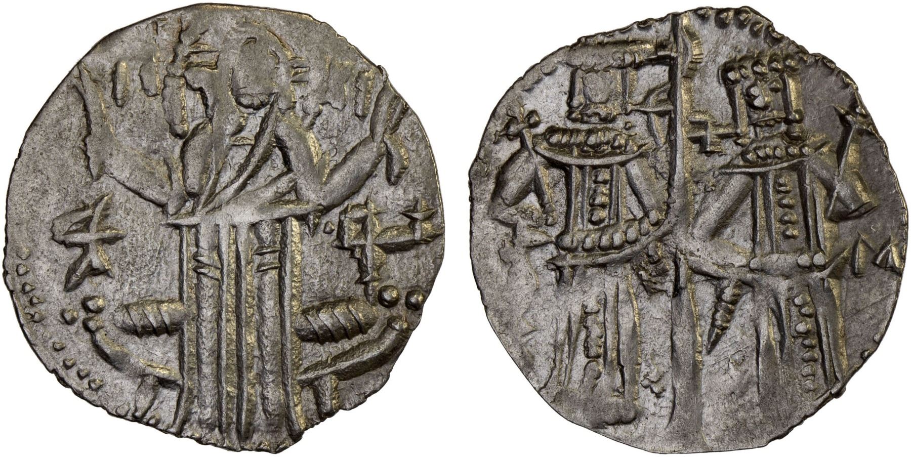BULGARIA: Ivan Alexander, 1331-1371, AR gros (1.59g), Dimnik & Dobrinic-9.1.2, enthroned Christ with cross halo, with both hands raised in blessing, with IC - XC on either side of head // the tsar left with son Michael Asen to right, both holding a long staff, with monograms for both, XF.