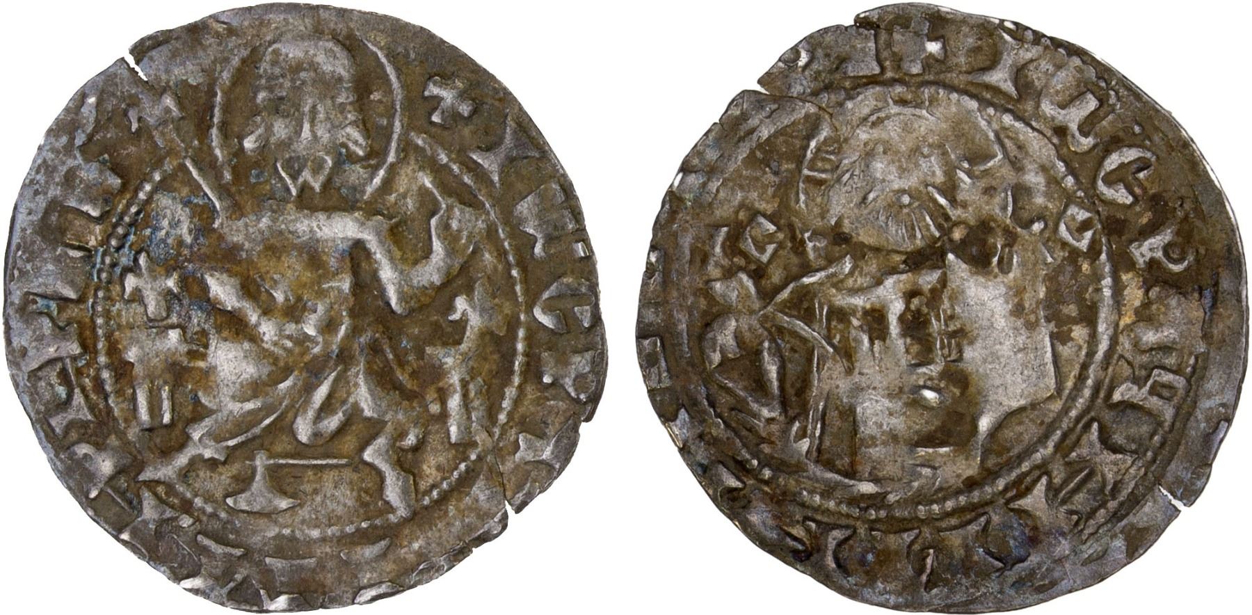BULGARIA: Iwan Strazimir, 1371-1395, AR grosso (0.75g), ND, Ljubic-III 2, enthroned ruler with nimbus // Christ giving blessing between IC - XC while holding book, XF.