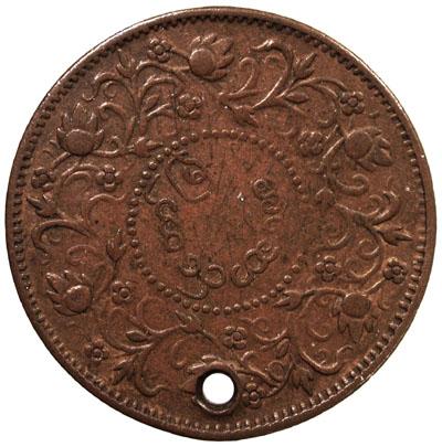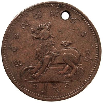 BURMA: AE 2 pyas (1/2 pe) (12.04g), BE1231, KM-24, R&S-14, Chinthe facing left, holed, choice Very Fine to Extremely Fine, RR, ex. Eck Prud'homme collection.