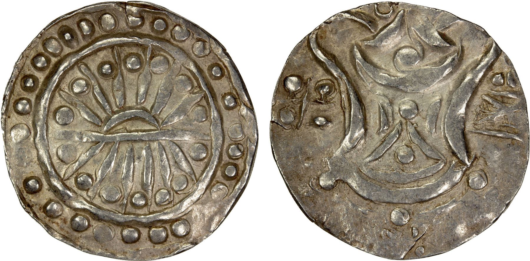 BURMA: Halin, AR unit (9.15g), after 7th century, Mahlo-8c.1, rising sun with 6 rays above and below // srivatsa with stylized center, swastika left, bhadrapitha right, crescent and sun above, bold strike, Choice VF.