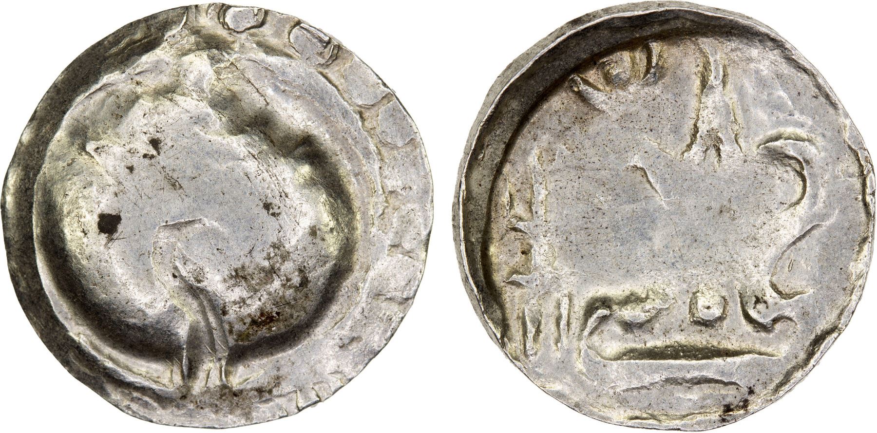 BURMA: KINGDOMS: Kyaikkatha: Anonymous, 9th/10th century, AR 1/4 unit (2.24g), Mahlo-63.2, balloon-shaped conch shell // srivatsa, double trident left and fly whisk right, fish below (weak); usual weakness on the reverse, XF, R. Mitchiner assigns this type to Syriam.