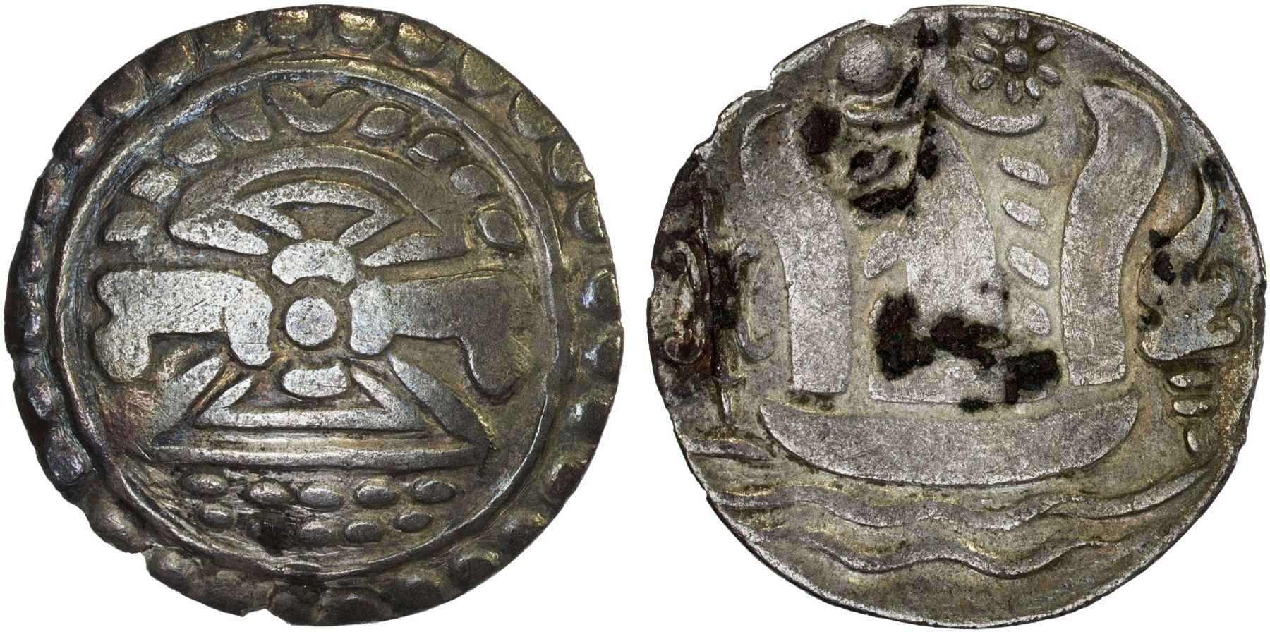 BURMESE KINGDOMS: Srikshetra, AR unit (8.26g), 6th century, Mahlo-13.4, bhadrapitha with 5 lamps above // srivatsa with yupa (world pillar) inside, flanked by vajra (thunderbolt) and shankha (conch shell), celestial symbols above, light cleaning scratches, a few spots of deposits on reverse, VF.