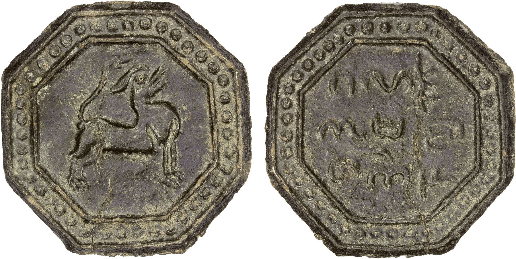 BURMA: KINGDOMS: Tenasserim: Anonymous, 17th/18th century, octagonal cast large tin coin (49.77g), VC-540.1.1 (same mold), 63mm, Tò (mythical antelope) facing right, without feathers on its legs and without holding something in its mouth // 3-line Burmese legend, with at least two additional characters not found on any forms of the legend indicated by Robinson (Van den Cruyce legend-B2.2), with the Chinese-style square in the center, XF, RRR. First published by van den Cruyce in 2023; this is the 4th example that has appeared in our auctions (previous Auctions 43, 47, and 49).