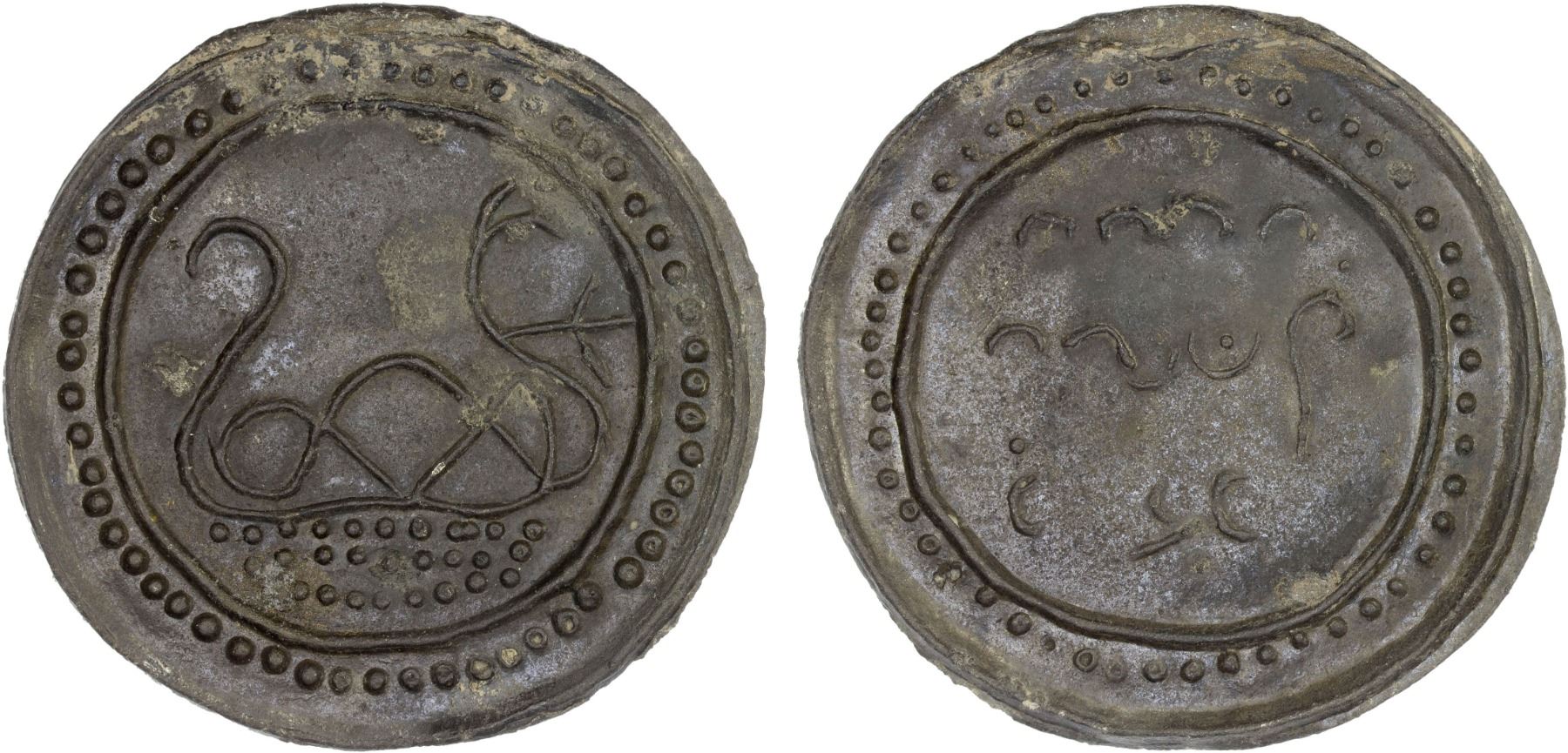 BURMA: KINGDOMS: Tenasserim-Pegu: Anonymous, 17th/19th century, cast large tin coin (24.62g), VC-221.2, Robinson-29, 63mm: stylized image of the "dragon on sea" (naga), minimal "head" and "tail", without any waves portrayed as dots beneath the naga // 3-line Burmese legend, XF-AU, R.