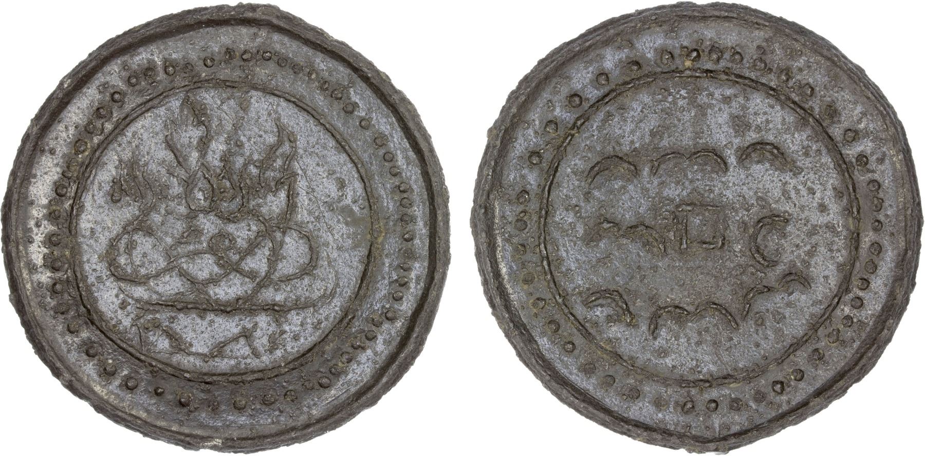 BURMA: KINGDOMS: Tenasserim-Pegu: Anonymous, 17th/19th century, cast large tin coin (30.46g), VC-611.2, 62.5mm: knotted dragon (naga) right, above a pedestal, with the lotus bud above // simplified 3-line Burmese legend with Chinese-style square in the center, AU, RR.