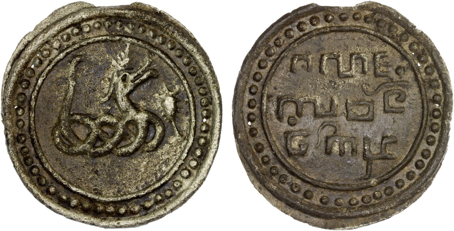 BURMA: KINGDOMS: Tenasserim-Pegu: Anonymous, 17th/19th century, cast large tin coin (53.8g), VC-101-var, 66.5mm: knotted dragon (naga) left with long protruding pointed tongue, no dots below the dragon // 3-line Burmese legend in square letters rather than the usual round letters; wonderful example, choice XF, R.