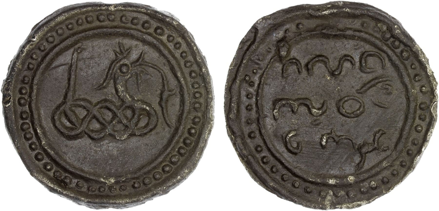 BURMA: KINGDOMS: Tenasserim-Pegu: Anonymous, 17th/19th century, cast large tin coin (67.2g), VC-101.2, 68mm: knotted dragon (naga) left with long protruding pointed tongue, no dots below the dragon // 3-line Burmese legend; superb quality, XF-AU, R.