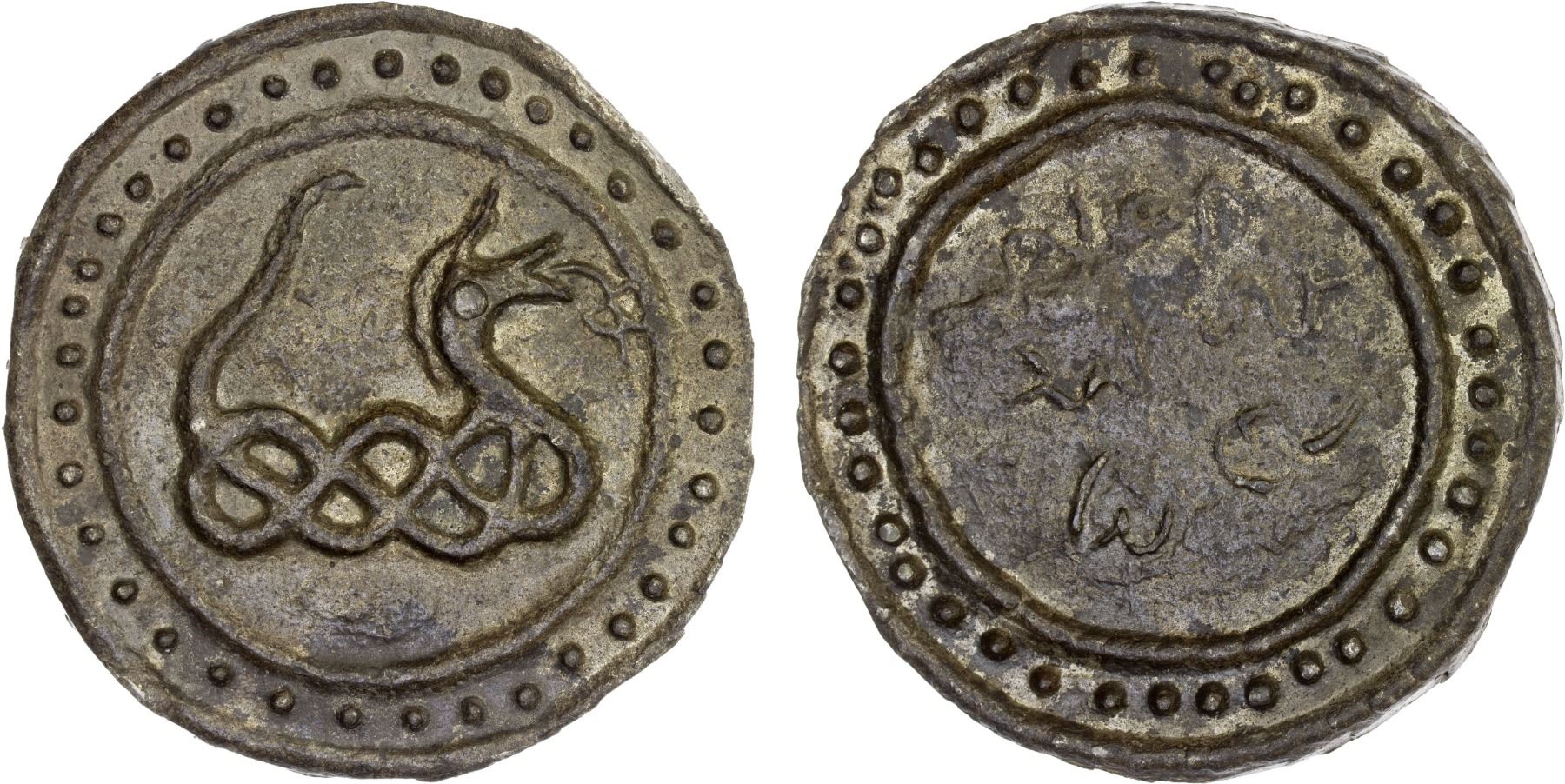 BURMA: KINGDOMS: Tenasserim-Pegu: Anonymous, 17th/19th century, cast large tin coin (76.04g), VC-102, 64.5mm: knotted dragon (naga) left with long protruding pointed tongue, no dots below the dragon // 3-line stylized Burmese legend; traces of original luster, Unc, R.