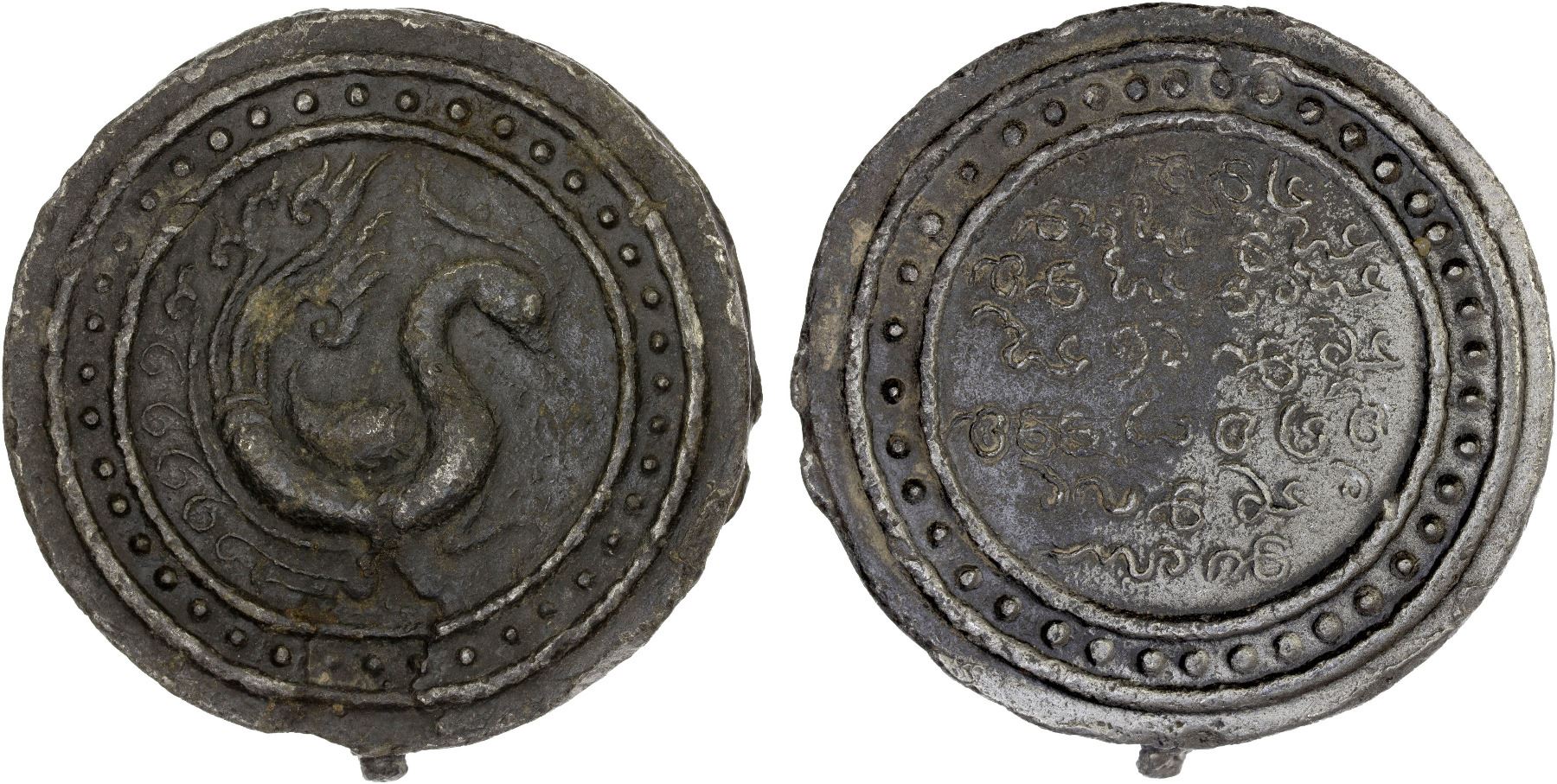 BURMA: KINGDOMS: Tenasserim-Pegu: Anonymous, 17th/19th century, cast lead weight (449g), VC-830, 78.5mm: hintha bird standing right, both legs fully engraved // undeciphered Burmese-Mon legend, carefully engraved; unusually nice example and beautifully preserved, XF, RR. Appears to be cast from the same molds as Van den Cruyce illustrated example for type 830.
