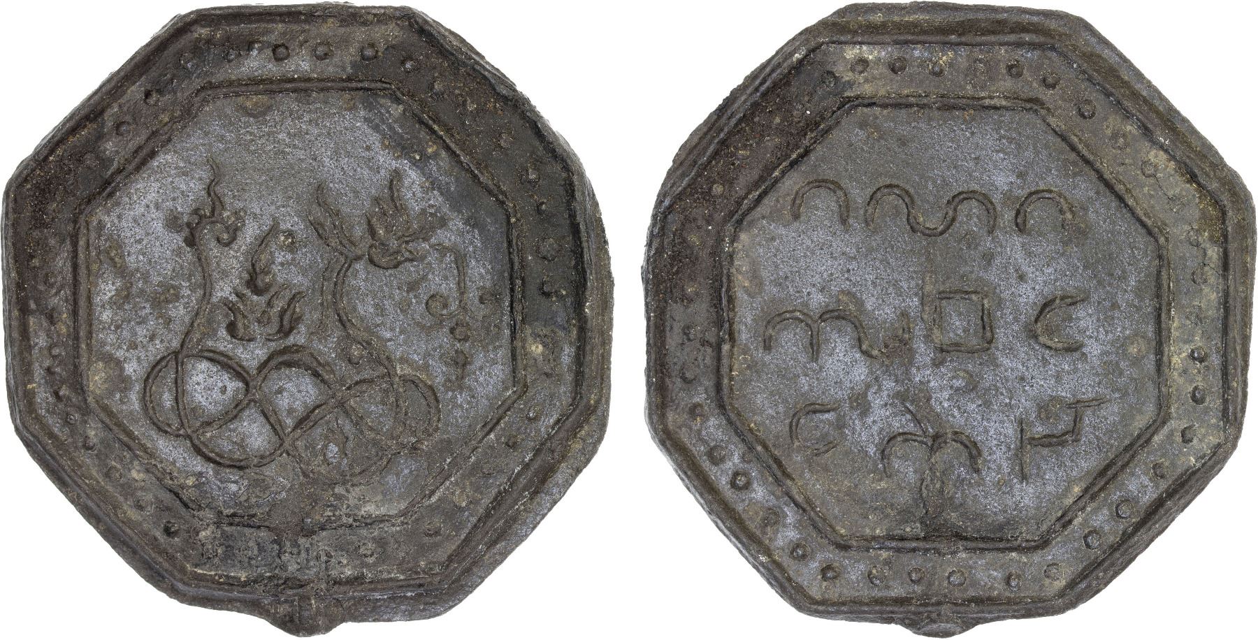 BURMA: KINGDOMS: Tenasserim-Pegu: Anonymous, 17th/19th century, cast octagonal large tin coin (28.72g), VC-620-var, Robinson Plate 13.6-var, 60mm: knotted dragon (Naga) left with long protruding pointed tongue, rare type without the pedestal below the dragon // 3-line Burmese legend with the Chinese square in the center (Robinson legend B4), XF-AU, R. This appears to be first known example of this rare type with a flower above the Naga.