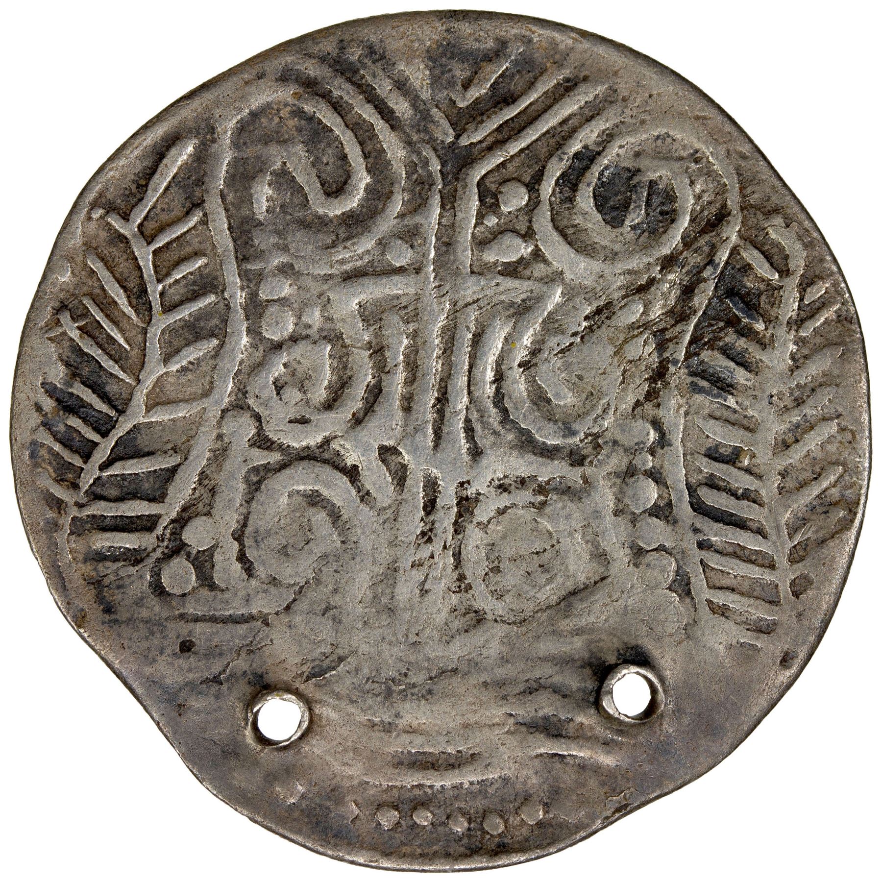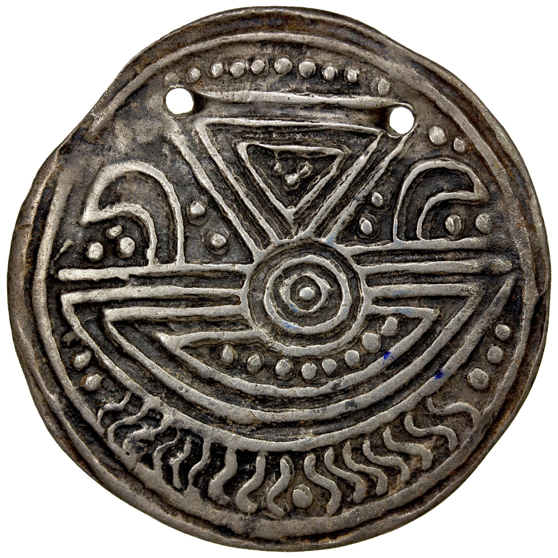 BURMA: MINEMAW: Anonymous, ca. 10th/12th century, AR amulet (6.13g), cf. Mahlo p.165 and Htun p.114-117, stylized bhadrapitha, with triple circle in the center // srivatsa, with waves of the river below, pierced twice for suspension, elaborate design derived from Mahlo-14, but with rising waves replacing the stupas within the srivatsa, choice VF, RR.