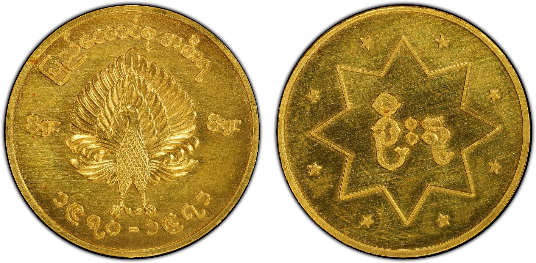 BURMA/MYANMAR: Patriotic Liberation Army, AV 4 mu, ND (1970-71), KM-45, peacock // name of Burmese nationalist leader, U Nu, within star, variety with bottom diacritical mark of Burmese letter cui hand punched, an incredible lustrous example! PCGS graded MS67, ex Howard A. Daniel III Collection. The Patriotic Liberation Army, a former rebel organization active in Myanmar from 1962-1974, issued three gold coins denominated 1, 2, and 4 mu. Each of the three coins is composed of pure 24-carat gold. A Green Peacock (Pavo muticus), a species of bird native to and revered in Myanmar, is displayed in the center of each coin's obverse. Above it is the Burmese title of the Union of Burma, and below the peacock are the dates 1970-1971 in Burmese numerals. Flanking the bird to the left and right are indications of the weight. Featured on the reverse of the three coins is the Burmese name of U Nu, the first and third Prime Minister of Myanmar. At some point, the government of the Union of Burma declared ownership of these coins illegal, and anyone in possession of one would be punished with death. As a result, many people often defaced the coins by pounding them into gold wafers.