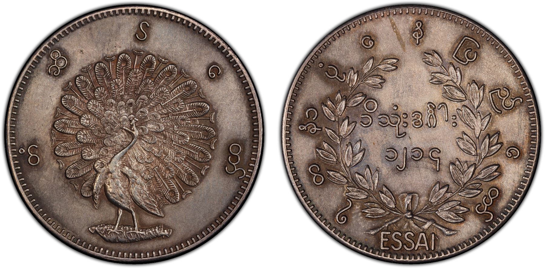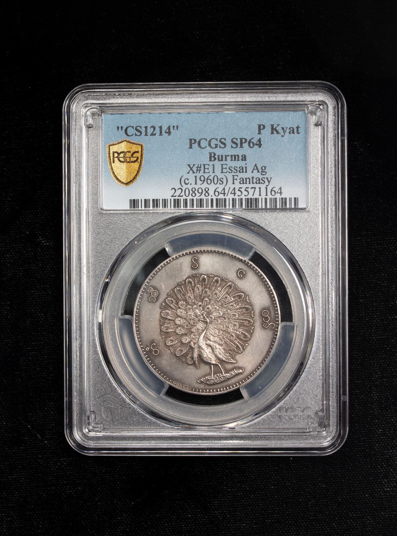 BURMA: Mindon, 1853-1878, AR kyat, CD1214, KM-XE1, fantasy issue marked ESSAI below the wreath on reverse, PCGS graded Specimen 64. This fantasy type was produced by Frank Lapa and struck in the late 1960s.