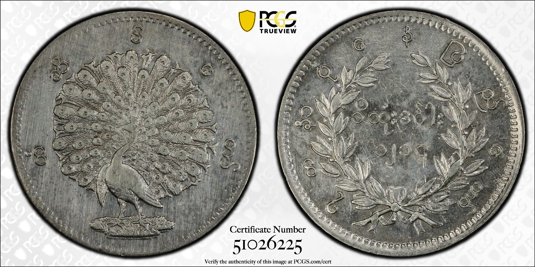 BURMA: Mindon, 1853-1878, AR kyat, CS1214 (1853), KM-10, once cleaned and re-toned but still hairlined, PCGS graded AU details, ex Almer H. Orr III Collection. The Early Modern Era Coinage issued by kings Mindon and Thibaw between 1852 and 1885 circulated in Upper Burma. Indian coins were current in Lower Burma, which was annexed in 1852. Burma coins are frequently known by the equivalent Indian denominations, although their values are inscribed in Burmese units. Upper Burma was formally annexed in January 1, 1886. Burma coins remained in circulation until 1889, when Indian coins became current throughout Burma. The machinery and dies for producing the 'peacock' series silver coins were imported from Birmingham, England. These peacock coins were issued from the Mandalay Mint, which was set up within the Mandalay palace complex, the ruins of which are still in existence. Actual mintage commenced 'Saturday, 9 waning Tasaungmon (November 11, 1865). In 1878, new bronze and gold coins bearing a lion motif were issued by Mindon's successor Thibaw, thus, silver kyat production ceased.