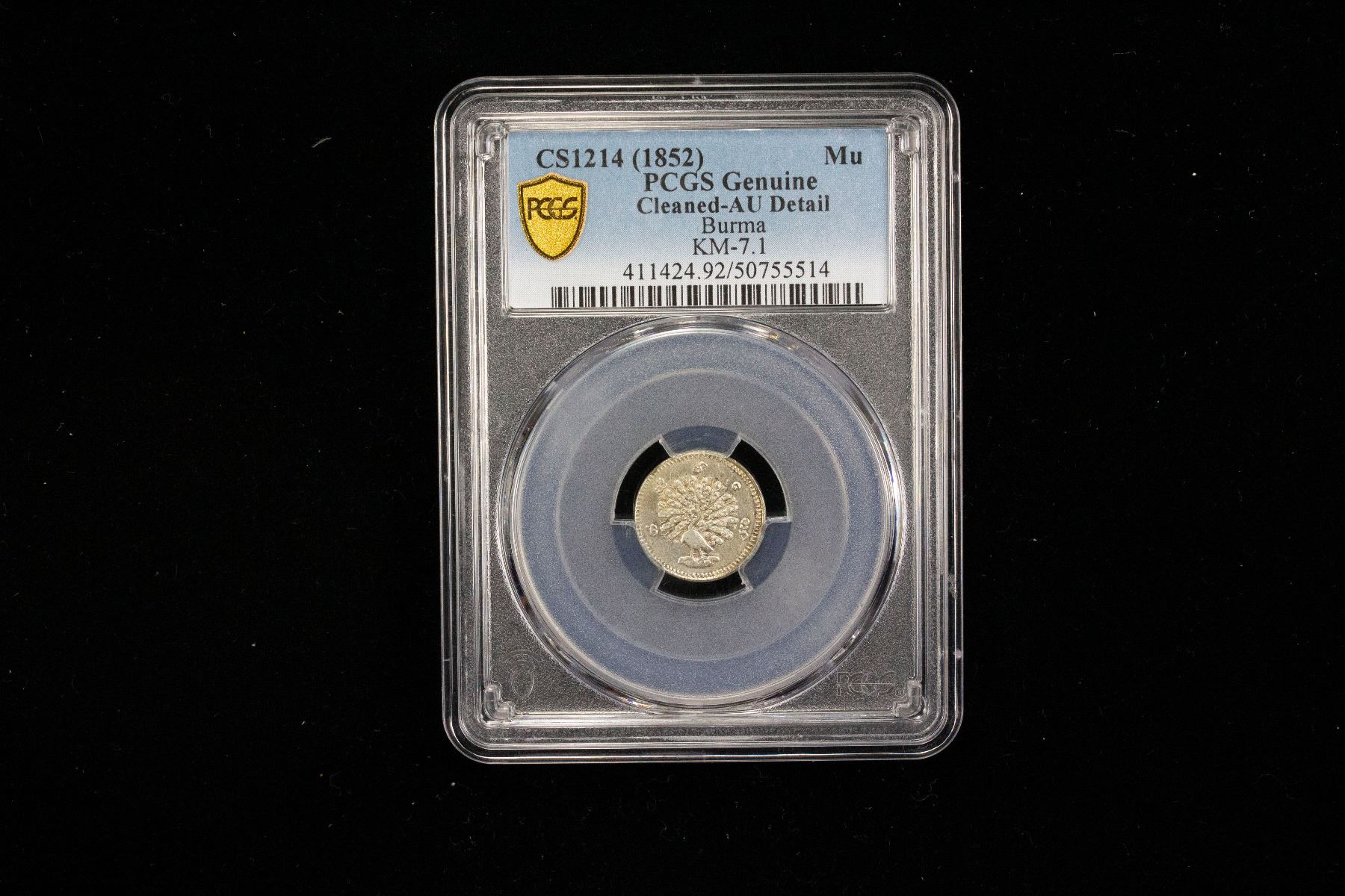 BURMA: Mindon, 1853-1878, AR mu, CS1214 (1853), KM-7.1, a well struck lustrous example, cleaned, PCGS graded AU details. The Early Modern Era Coinage issued by kings Mindon and Thibaw between 1852 and 1885 circulated in Upper Burma. Indian coins were current in Lower Burma, which was annexed in 1852. Burma coins are frequently known by the equivalent Indian denominations, although their values are inscribed in Burmese units. Upper Burma was formally annexed in January 1, 1886 and the Burma coins remained in circulation until 1889, when Indian coins became current throughout Burma.The machinery and dies for producing the 'peacock' series silver coins were imported from Birmingham, England. These peacock coins were issued from the Mandalay Mint, which was set up within the Mandalay palace complex, the ruins of which are still in existence.