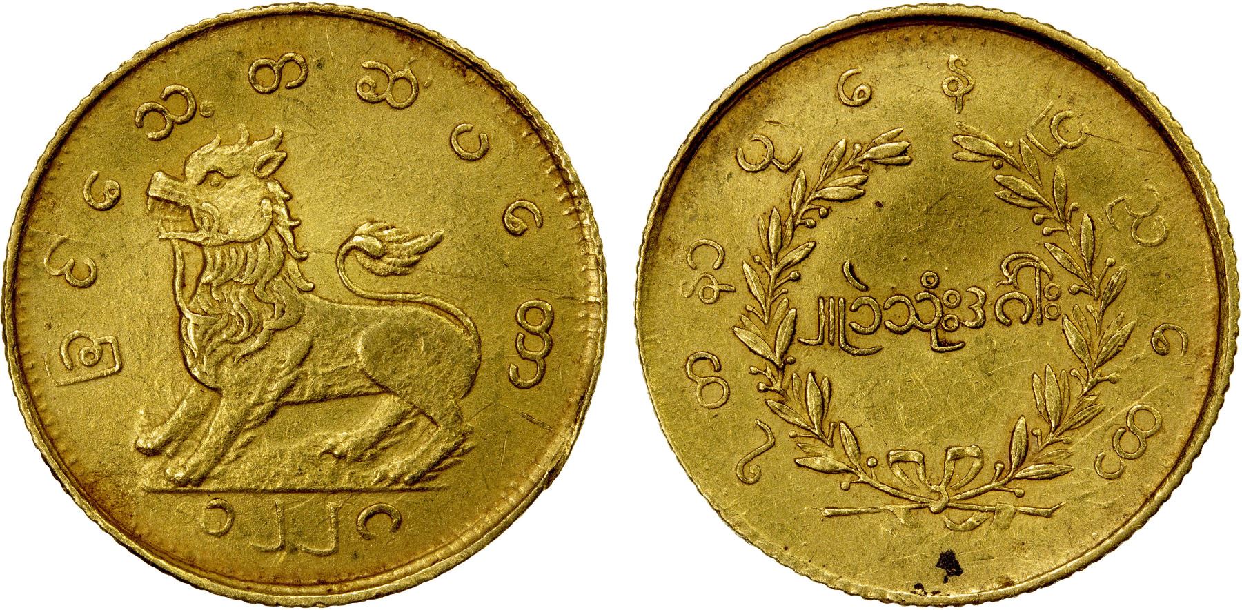 BURMA: Mindon, 1853-1878, AV 2 mu 1 pe (2.89g), CS1228 (1866), KM-20, Chinze dog on obverse, never mounted, EF, RR, ex Hans Monsdorf Collection, ex Choudhury Collection (originally sold in our Auction 27, Lot 961, in January 2017).