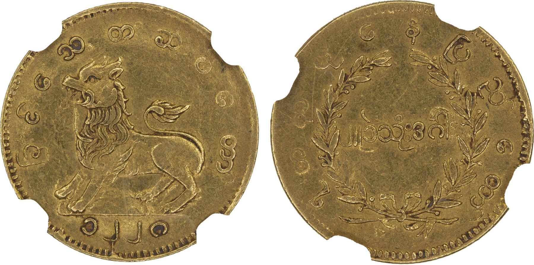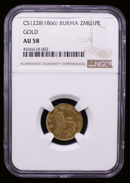 BURMA: Mindon, 1853-1878, AV 2 mu 1 pe, CS1228 (1866), KM-20, struck in Mandalay, mythical lion (chinthe) left, an excellent example of this rare type, NGC graded AU58.