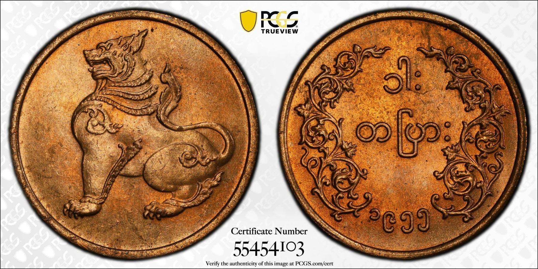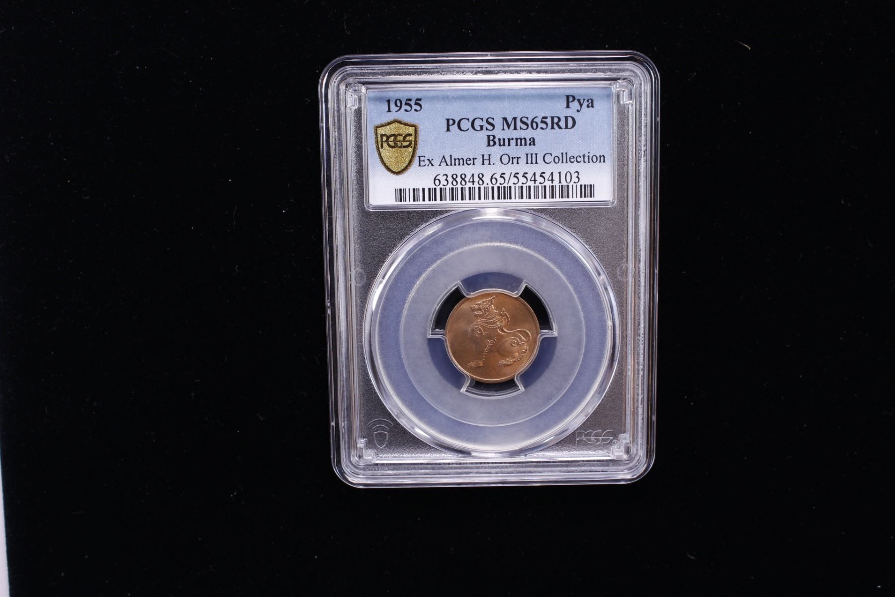 BURMA: Union, AE pya, 1955, KM-32, lustrous, PCGS graded MS65 RD, ex Almer H. Orr III Collection.