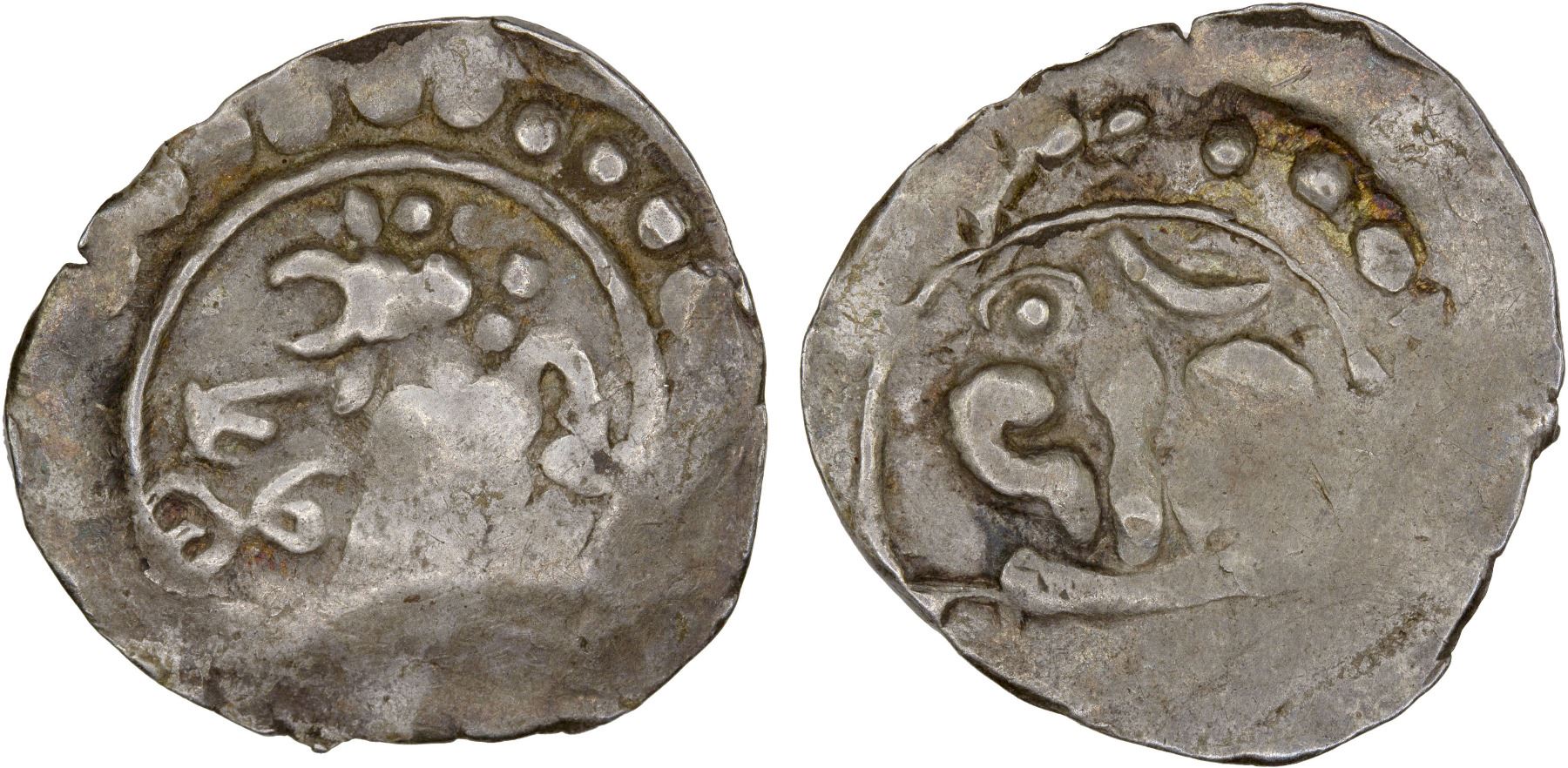 BURMESE KINGDOMS: Candra: Niticandra, early 6th century, AR 16 ratti (1.88g), Mitch-SEA-103ff, humped bull reclining right, king's name above // srivatsa flanked by stylized leaf tendrils, pellet-in-circle and crescent above, some weakness of strike, VF, ex Howard A. Daniel III Collection.