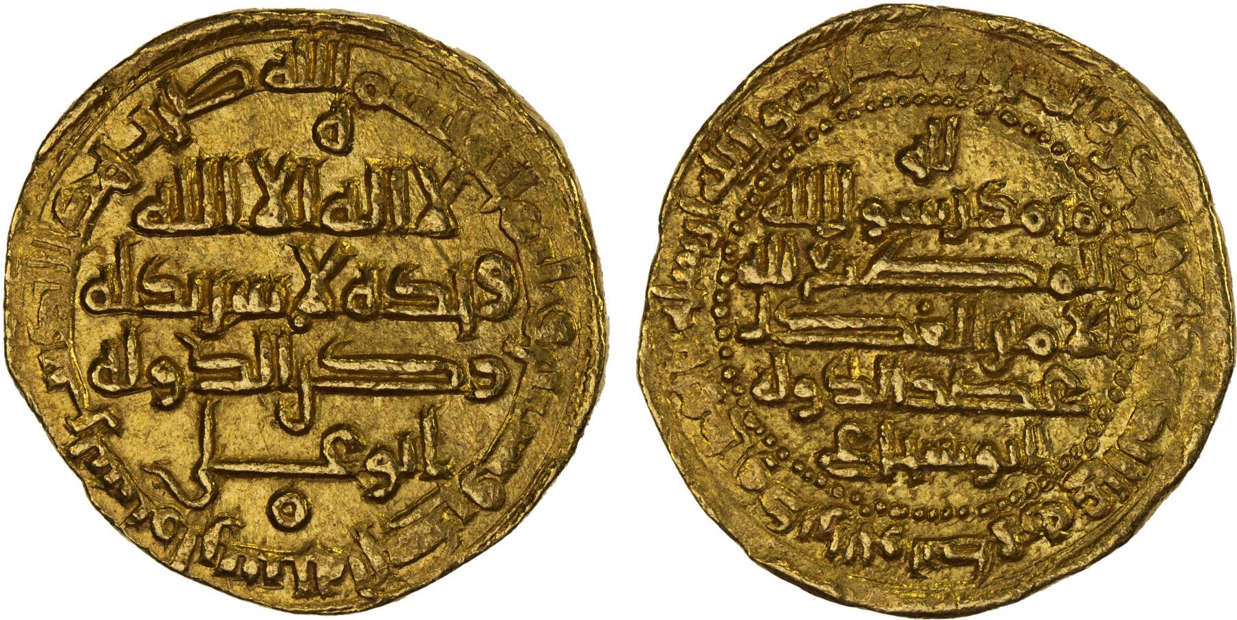 BUWAYHID: 'Adud al-Dawla, 949-983, AV dinar (4.28g), Shiraz, AH361, A-1549, also citing the chief ruler Rukn al-Dawla, average strike, XF, RR. Although Shiraz is the most common mint for silver, it is surprisingly rare for gold, reported only for AH359, 360, 361, 385, 434, 435, and 437, of which only 435 is the least rare.