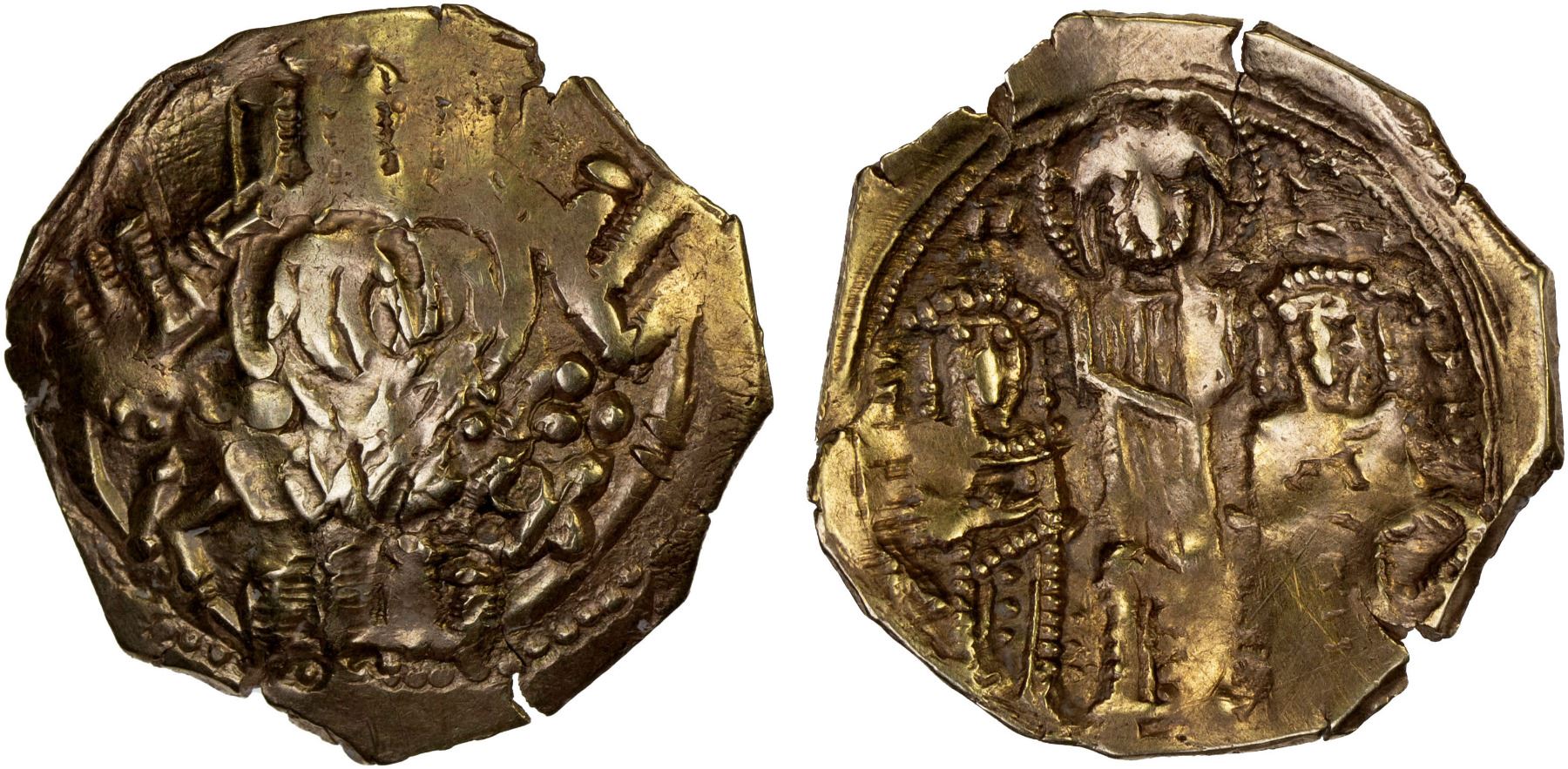 BYZANTINE EMPIRE: Andronicus II & III, 1325-1334, EL hyperpyron (2.81g), Constantinople, SB-2461, bust of the Virgin orans, city walls with four towers around, K-X across field // Christ standing facing in center, blessing Andronicus II and Andronicus III kneeling to left and right, IC-XC across field, faint graffiti on reverse, XF.