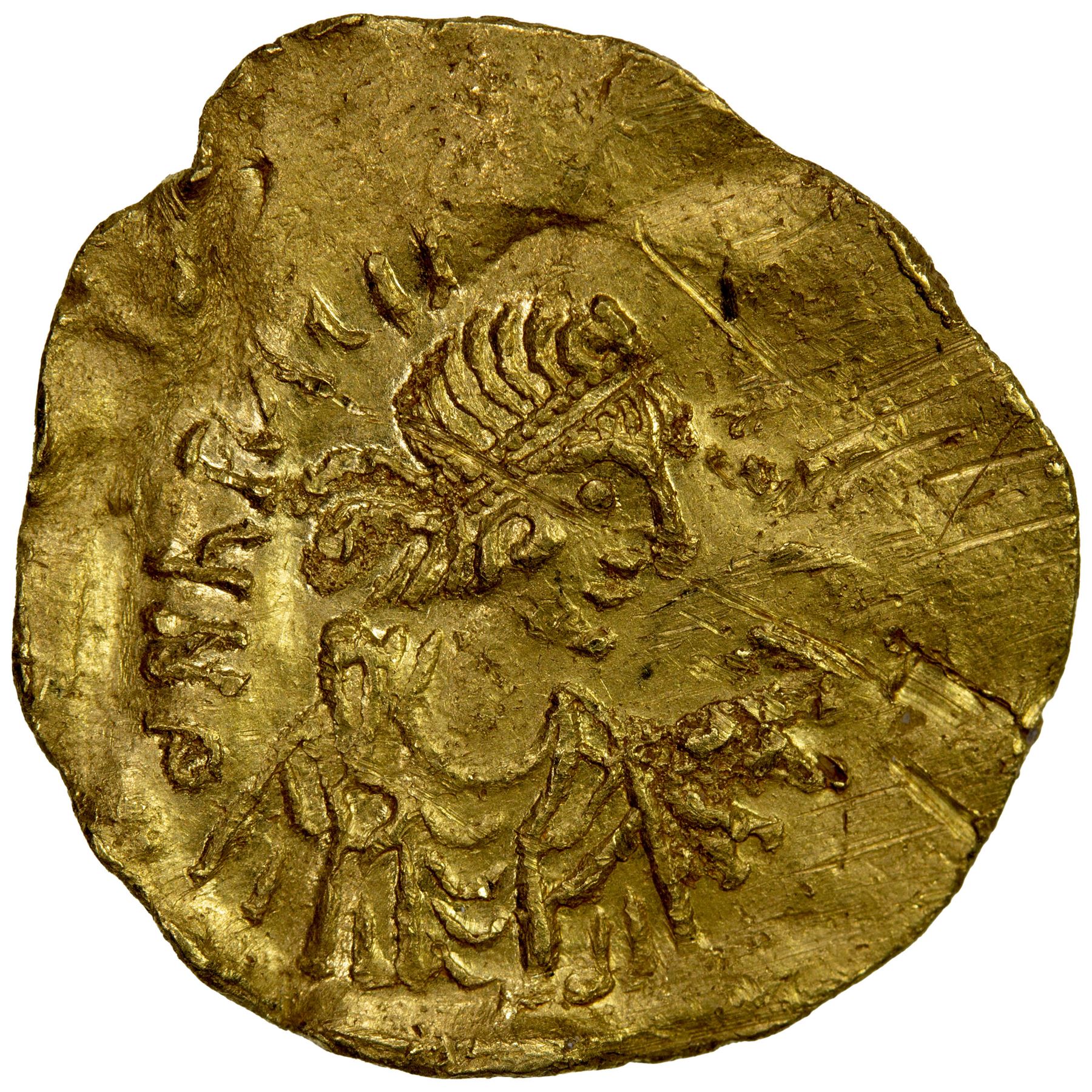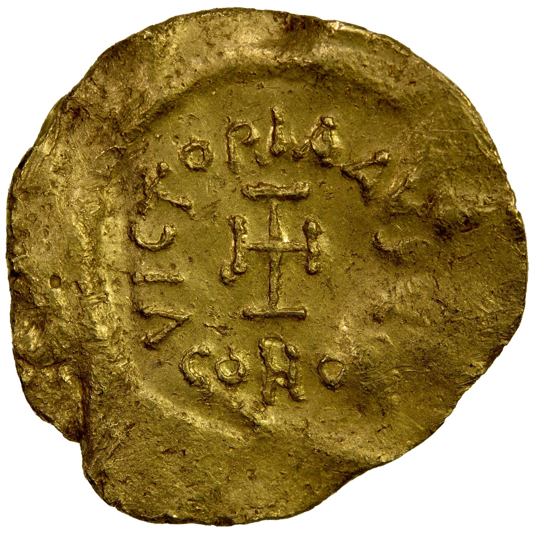 BYZANTINE EMPIRE: Heraclius, 610-641, AV tremissis (1.43g), Constantinople, ND, S-786/7, diademed, draped, and cuirassed bust right with "d N hERACLIUS PP AVG" (or something similar) around // central cross potent with VICTORIA AVGU (or something similar) around and CONOB below, legends a bit uncertain from somewhat bent flan with some damage, small obverse scrape, EF.