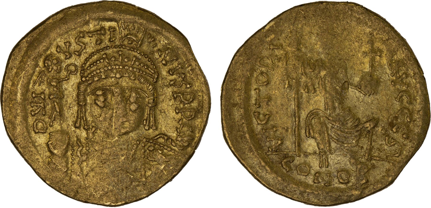 BYZANTINE EMPIRE: Justin II, 565-578, AV solidus (4.46g), Constantinople, 567-578, SB-345, 6th officina, cuirassed bust facing, wearing helmet with pendilia, holding Victory on globe in right hand and shield with horseman motif in left, D N IVSTINVS P P AVG // Constantinopolis seated facing, helmeted head right, holding scepter and globus cruciger, VICTORIA AVGGG ς, CONOB in exergue, a few light scratches, some weakness, Choice XF.