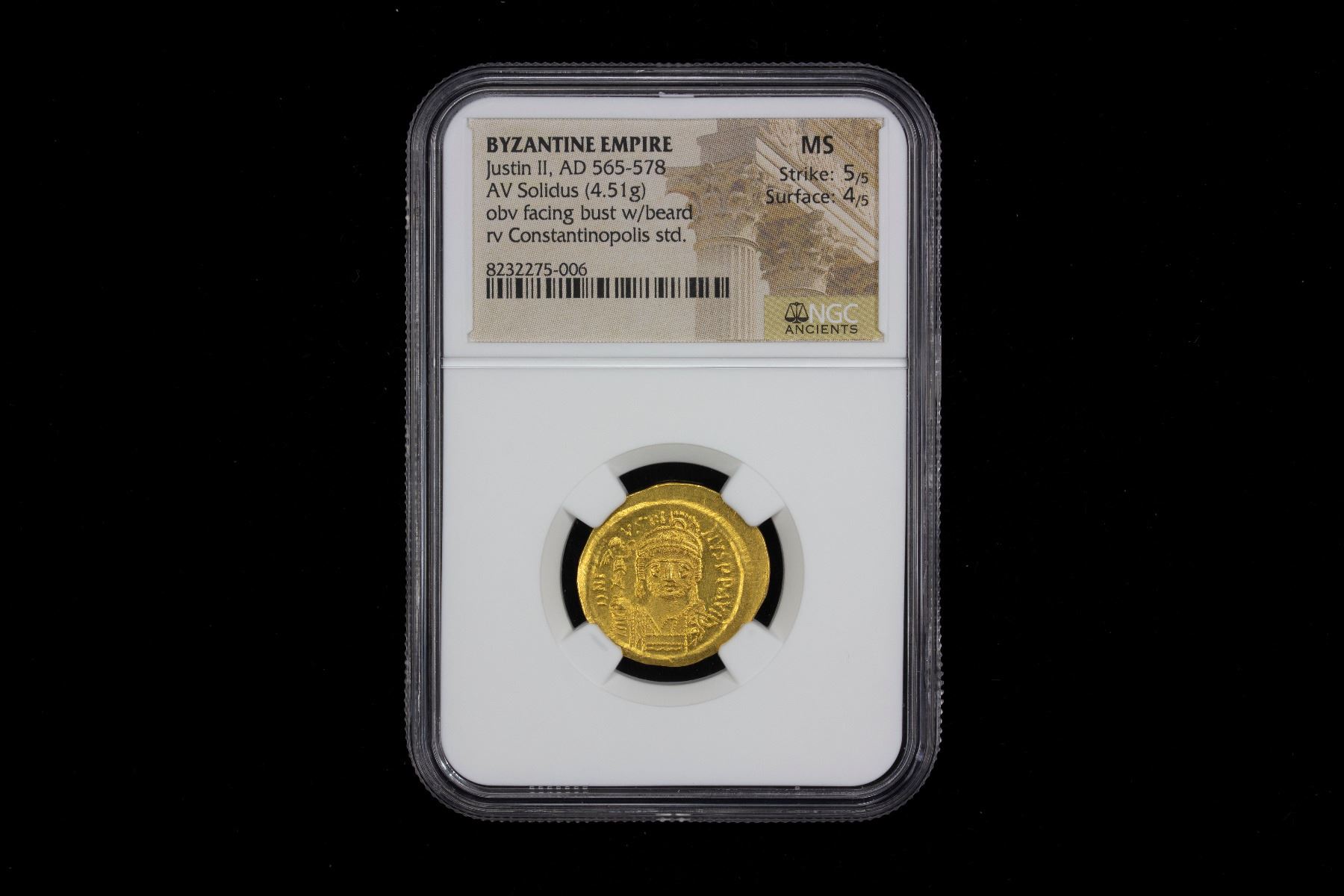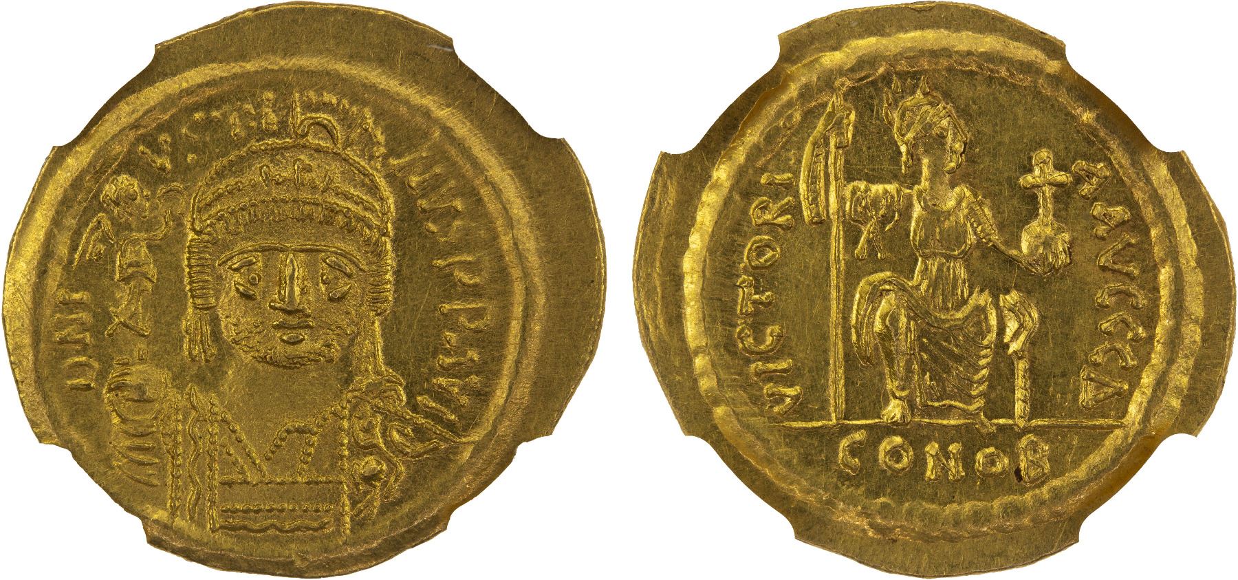 BYZANTINE EMPIRE: Justin II, 565-578, AV solidus (4.51g), Constantinople, SB-344, 4th officina, cuirassed bust facing, wearing helmet with pendilia, holding Victory on globe in right hand and shield with horseman motif in left, DN IVSTINVS P P AVG // Constantinopolis seated facing, helmeted head right, holding scepter and globus cruciger, VICTORIA AVGGG Δ blazing golden luster, Strike 5/5, Surface 4/5, NGC graded Mint State.