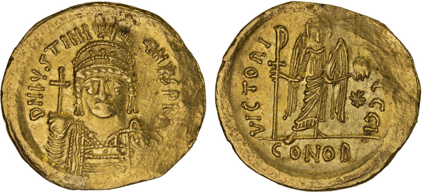 BYZANTINE EMPIRE: Justinian I, 527-565, AV solidus (4.38g), Constantinople, 542-565, SB-140, 10th officina, cuirassed bust facing, wearing helmet with pendilia, holding globus cruciger and shield decorated with horseman motif, D N IVSTINIANVS P P AVG // angel standing facing, holding staurogram-tipped staff and globus cruciger, star in right field, VICTORIA AVGGG I, graffito on reverse, attractive light luster, AU-UNC