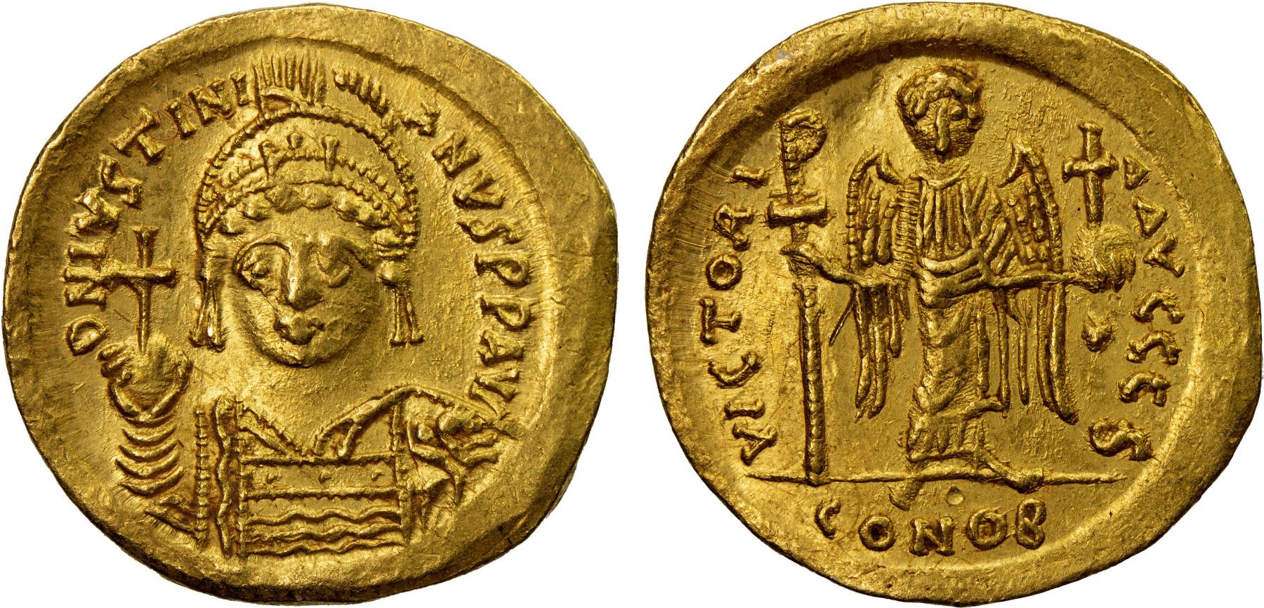 BYZANTINE EMPIRE: Justinian I, 527-565, AV solidus (4.39g), Constantinople, 545-565, S-140, 6th officina, cuirassed bust facing, wearing helmet with pendilia, holding globus cruciger and shield decorated with horseman motif, D N IVSTINI-ANVS PP AVG // angel standing facing, holding staurogram-tipped staff and globus cruciger, star in left field, VICTORI-A AVGGG, CONOB in exergue, VF-EF.