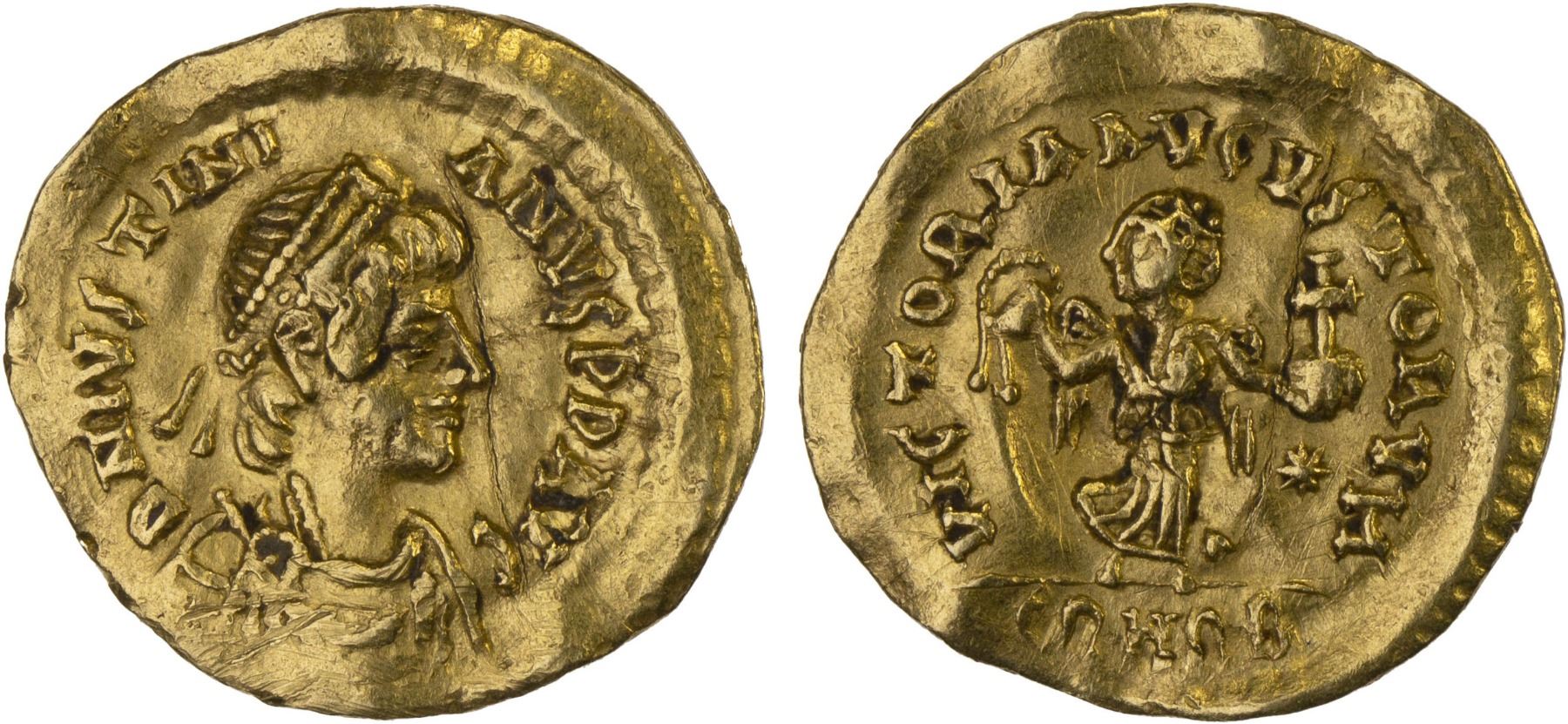 BYZANTINE EMPIRE: Justinian I, 527-565, AV tremissis (1.46g), Constantinople, SB-145, diademed, draped, and cuirassed bust right // Victory advancing right with head left, holding wreath and globus cruciger, star to right, small crease, lightly wavy flan, some hairlines, VF-XF.