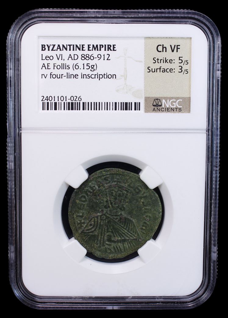 BYZANTINE EMPIRE: Leo VI, 886-912, AE follis (6.15g), Constantinople, SB-1729, crowned bust facing, wearing chlamys, holding akakia // + LEOn / En ΘEO bA- / SILEVS R- / OMEOn, green patina, Strike 5/5, Surface 3/5, NGC graded Choice VF.