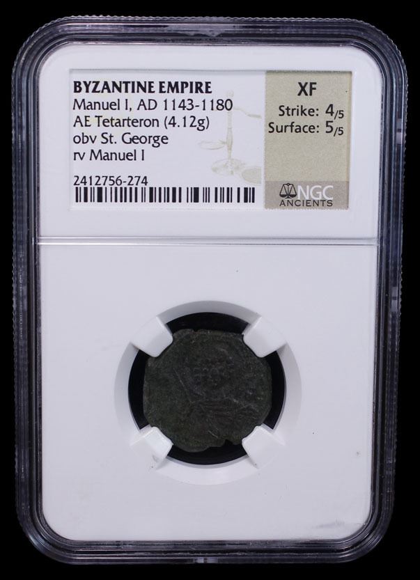 BYZANTINE EMPIRE: Manuel I Comnenus, 1143-1180, AE tetarteron (4.12g), Thessalonica, SB-1975, half-length bust of St. George, holding spear and shield // crowned half-length bust of the emperor, holding labarum and globus cruciger, Strike 4/5, Surface 5/5, NGC graded XF.