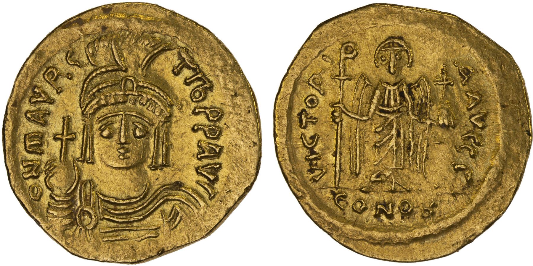 BYZANTINE EMPIRE: Maurice Tiberius, 582-602, AV solidus (4.26g), Constantinople, SB-478, 3rd officina, draped and cuirassed bust facing, wearing plumed helmet with pendilia, holding globus cruciger in right hand, o N mAVRC TIb P P AVG // angel standing facing, holding staurogram-tipped staff and globus cruciger, VICTORIA AVGG Γ CONOB in exergue, faint hairlines, attractive light luster, Choice About Unc.