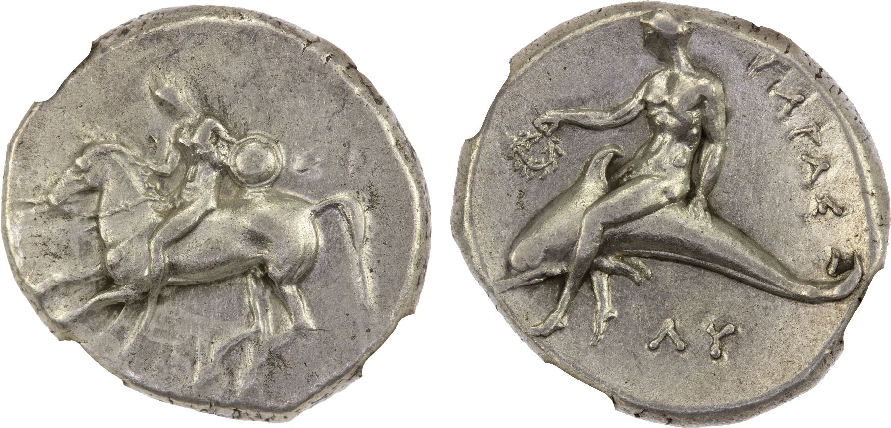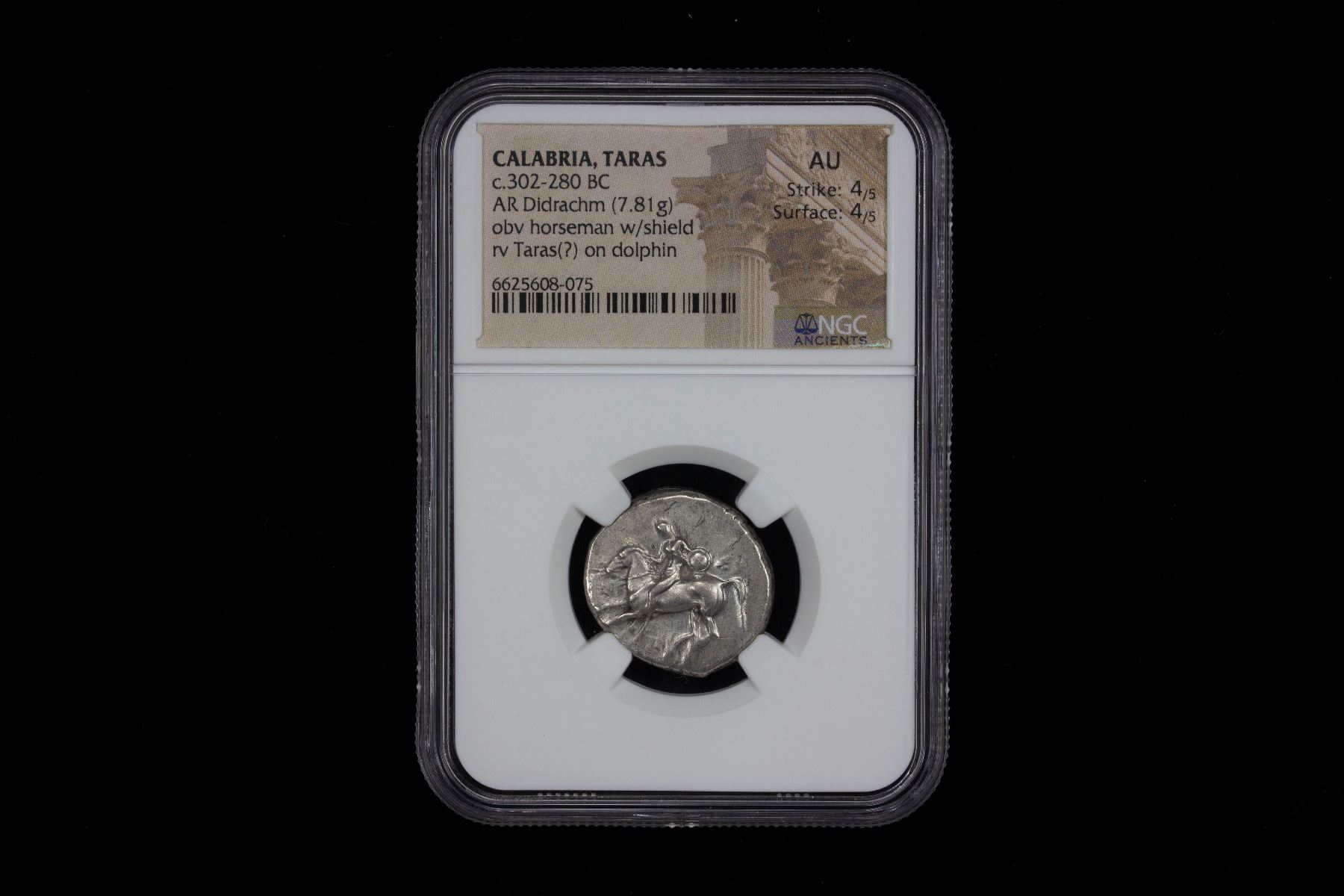 CALABRIA: Tarentum, AR nomos (didrachm) (7.81g), ca. 302-280 BC, Vlasto-689, HNI-965, magistrates Si-, Philokles, and Lu-, rider on horse galloping left, holding shield, ΣI to right, magistrate name below horse // Phalanthos riding dolphin left, holding wreath, ΛY below, TAPAΣ to right, lightly lustrous, Strike 4/5, Surface 4/5, NGC graded AU