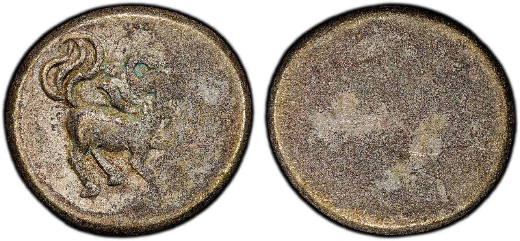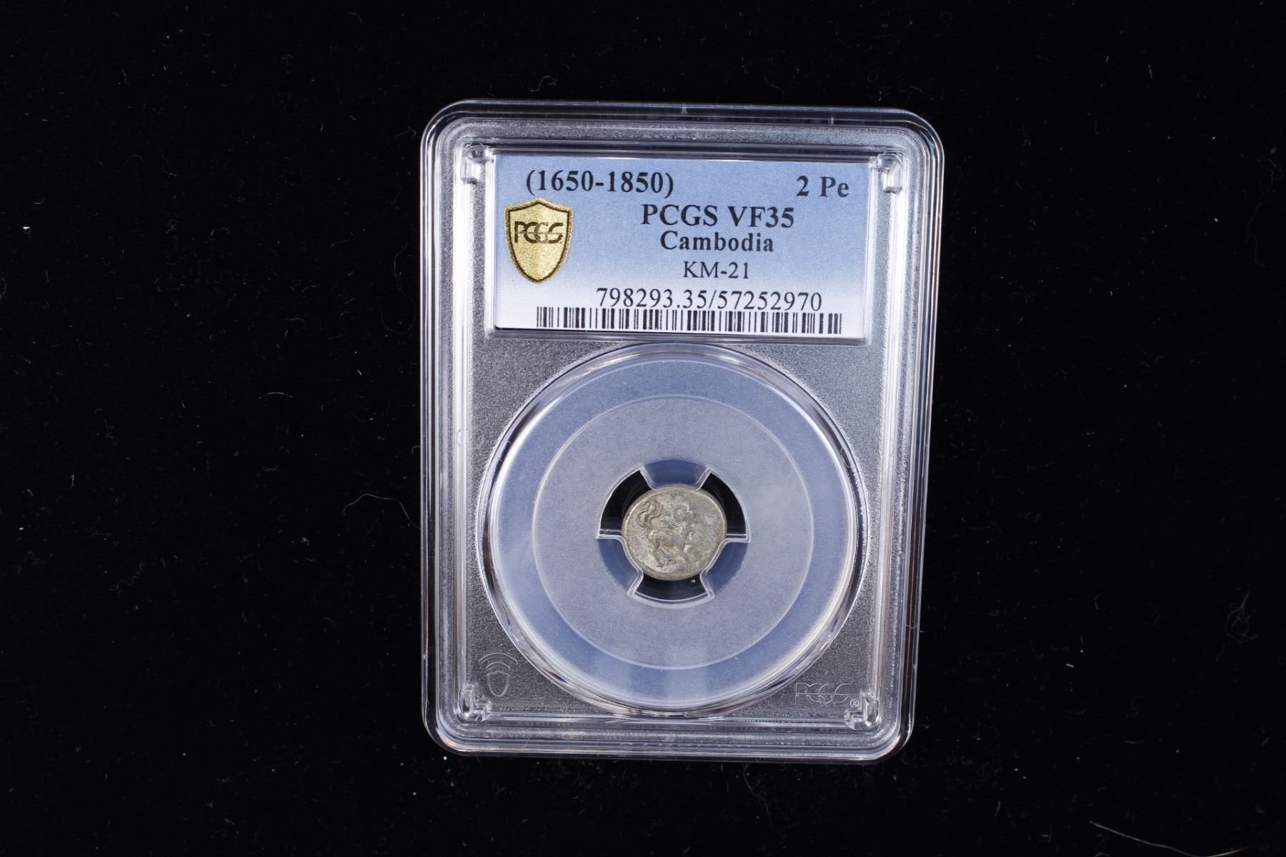 CAMBODIA: AR 2 pe (1.62g), ND (1650-1850), KM-21, Daniel-47, deer right, uniface, the single highest graded example at PCGS (Top Pop), a very rarely encountered type, PCGS graded VF35.