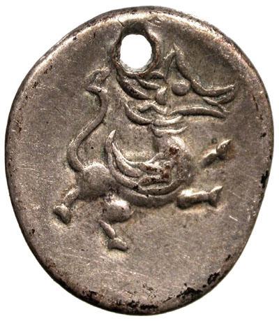 CAMBODIA: AR 2 pe (½ fuang), ND (1847), KM-21, pierced, hippogriff right, Very Fine, S, ex. J. Silvestre Collection. J. Silvestre was a French colonial administrator in Indochina and the author of the The Coins and Medals of Annam published in the American Journal of Numismatics, Vol. 37, #3 in 1903. This type is likely a pattern issue and unpublished.