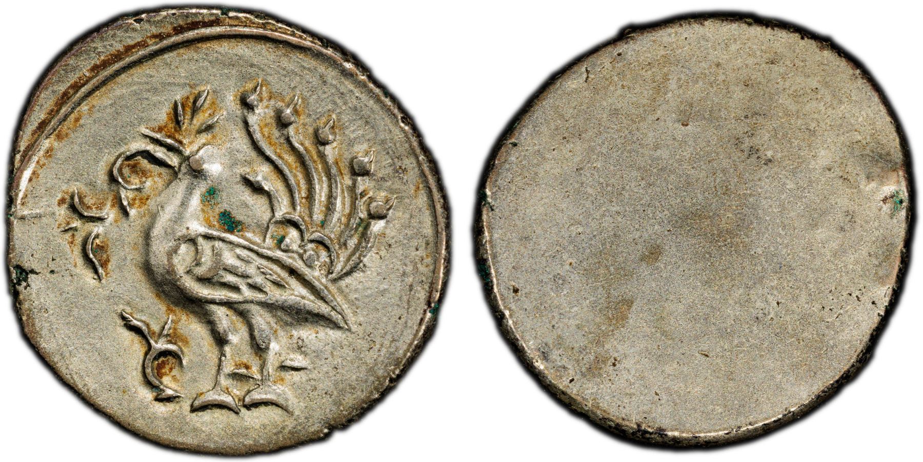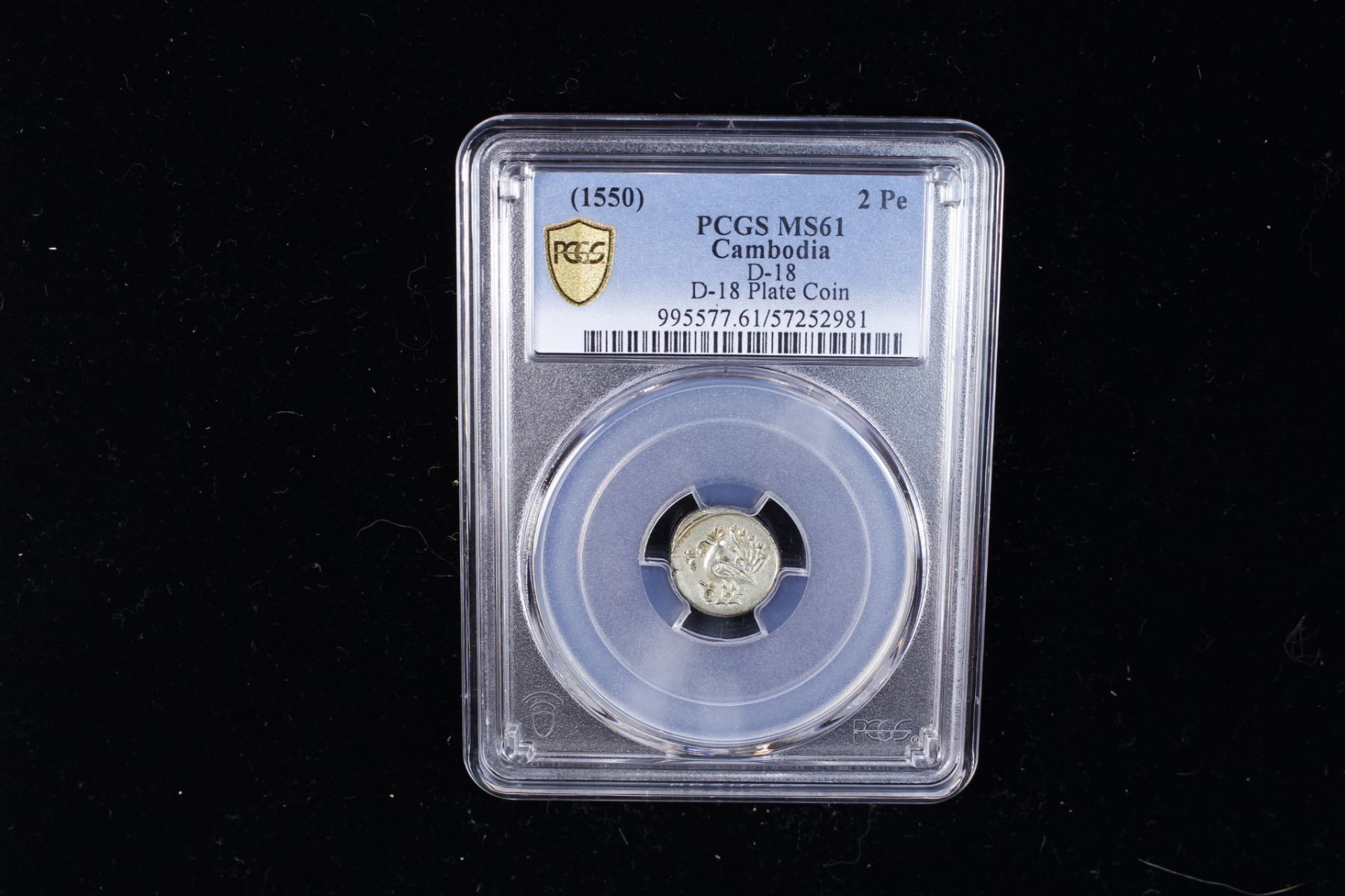 CAMBODIA: AR 3 pe (1.49g), ND, Daniel-18 (this piece), Panish-9d, Semans-K10a, KM-unlisted, peacock left, intricately designed, an extremely rare type, presently the only piece certified at PCGS, and a superb example, PCGS graded MS61, ex Howard A. Daniel III Collection (the plate example in his book).