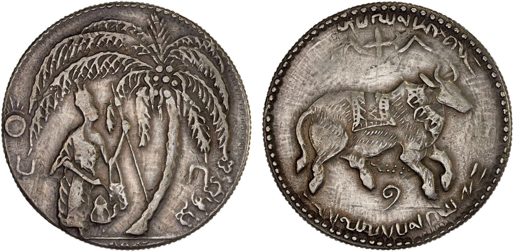 CAMBODIA: AR charm (26.48g), ca. early 20th century, Zeno-337181 (this example), cf. Cribb p.275 fig.11, 40mm, figure walking right, holding tea kettle, poking base of palm tree with long staff, radiant sun to left, inscriptions to right and in exergue // Nandi recumbent right, imitative legend above, the numeral 1 below, marginal inscriptions above and below, re-engraved from a 1909 French Indochina piastre, with traces of original legends still visible, likely used as a Hindu temple token or religious amulet, Choice XF.