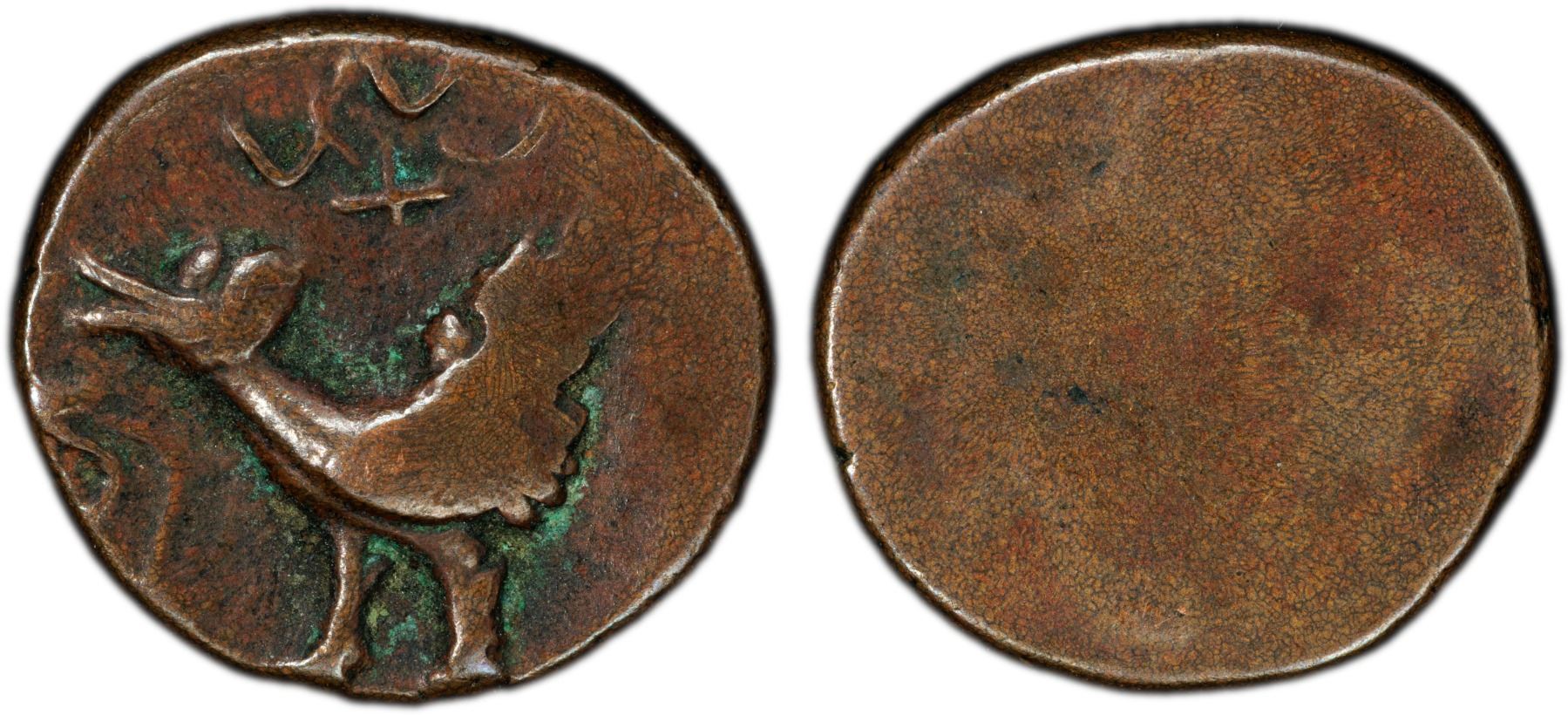 CAMBODIA: Ang Duong, 1840-1860, AE att (2.29g), CS1208 (1847), KM-1, hamsa bird left, date above, uniface, rich glossy brown patina, PCGS graded VF20.