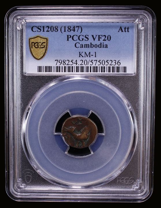 CAMBODIA: Ang Duong, 1840-1860, AE att (2.29g), CS1208 (1847), PCGS VF20