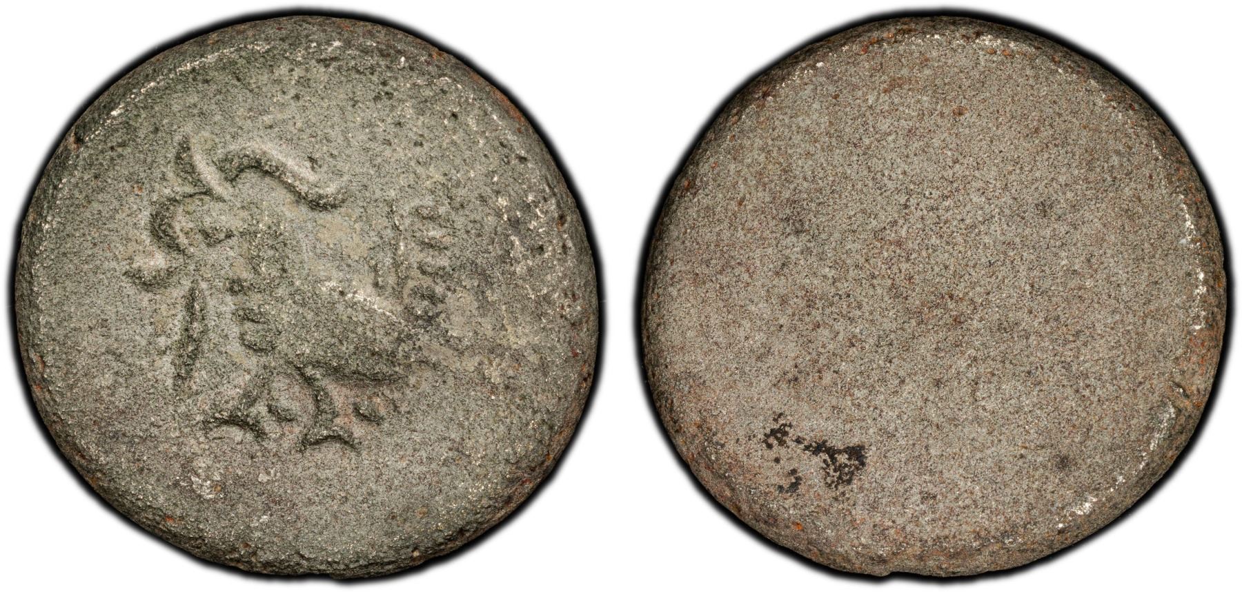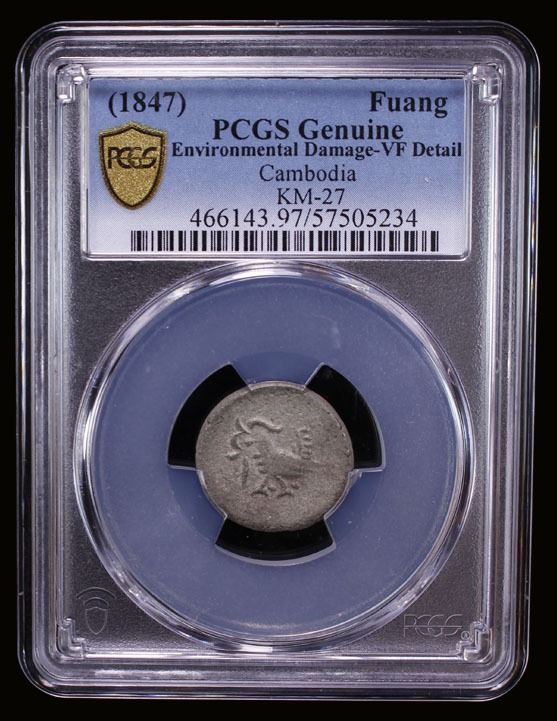CAMBODIA: Ang Duong, 1840-1860, AR 4 fuang (1/4 tical) (5.31g), ND (ca. 1847), KM-27, hamsa bird left, uniface, environmental damage, PCGS graded VF details, RR. This is among the largest and heaviest "hamsa" bird-types we have encountered.