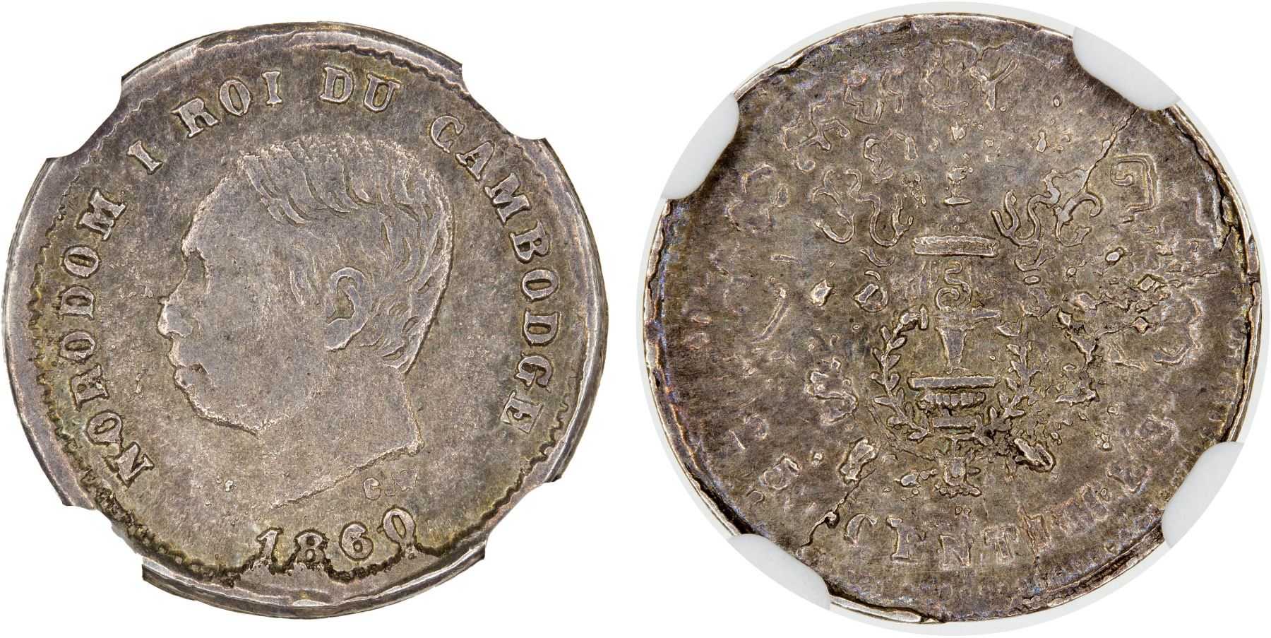 CAMBODIA: Norodom I, 1859-1904, AR 25 centimes, 1860, Bruce-XM4, Lecompte-38, Daniel-83b, plain edge, restrike, very scarce, NGC graded AU58, ex The Paris Collection.