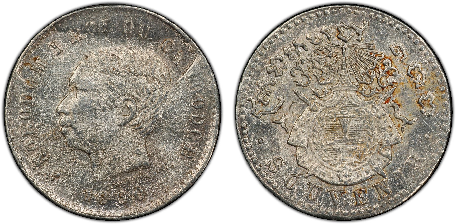 CAMBODIA: Norodom I, 1859-1904, AR 50 centimes, 1860, Lecompte-109, "souvenir" issue, plain edge, rusted obverse die, very rare, PCGS graded Specimen 63, ex The Paris Collection.