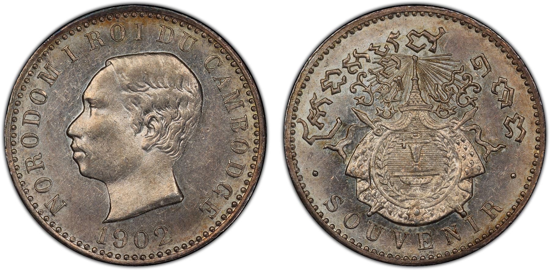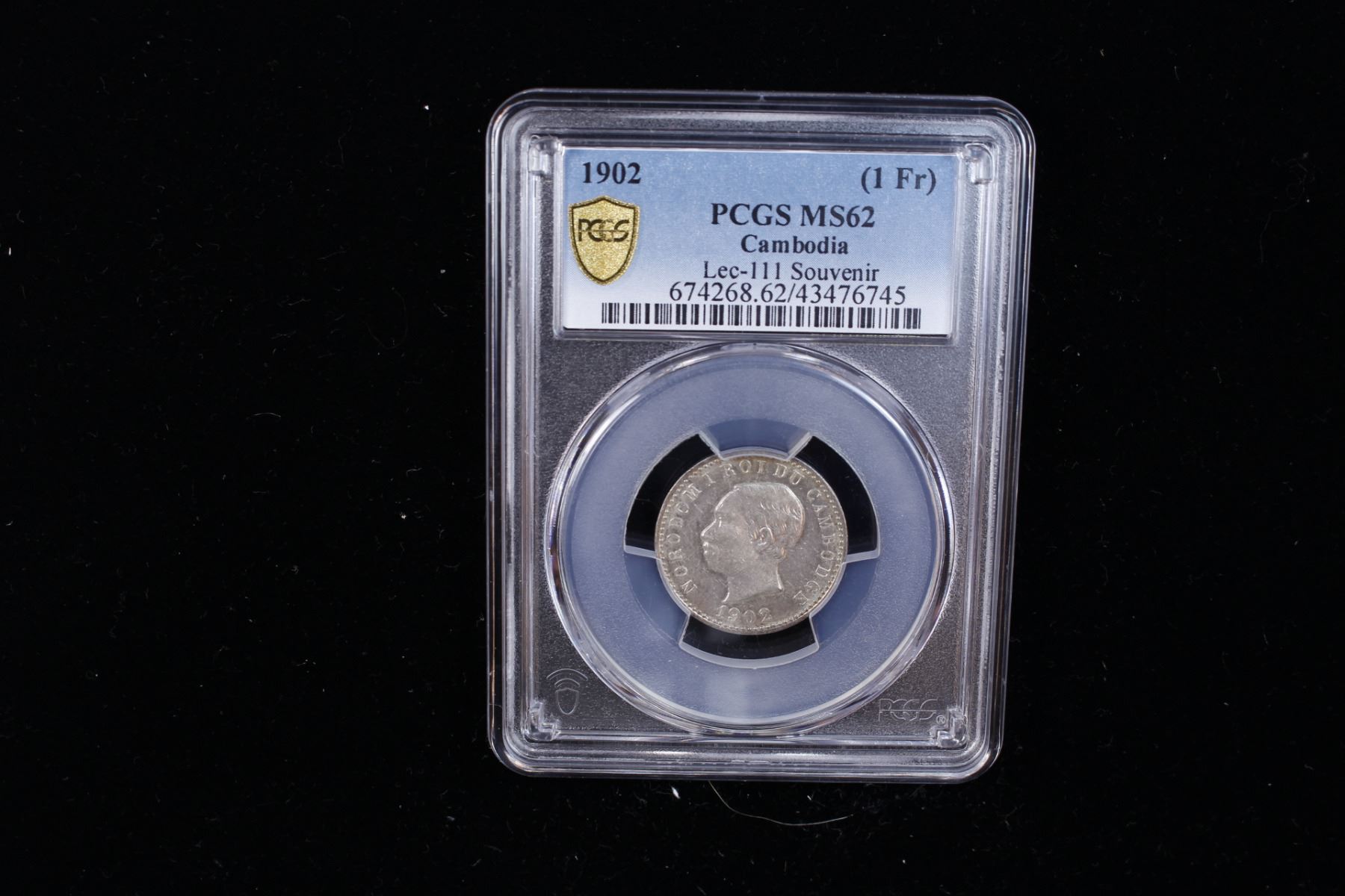CAMBODIA: Norodom I, 1859-1904, AR franc, 1902, Lecompte-111, Daniel-P85g, "souvenir issue", lustrous, rare, mintage of only 250 pieces, PCGS graded MS62, ex The Paris Collection. Minted and sold at the Hanoi Exposition in 1902-3.