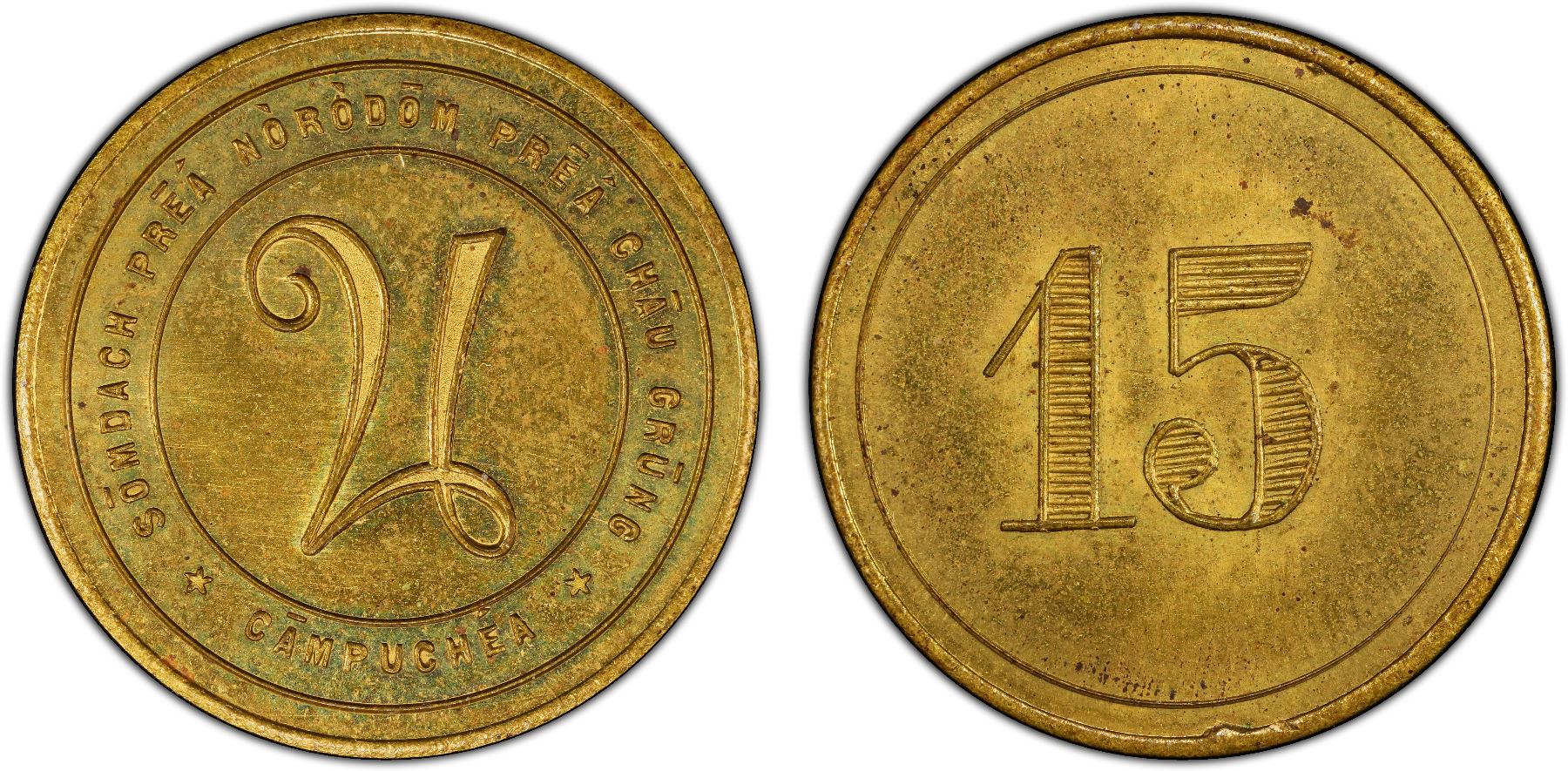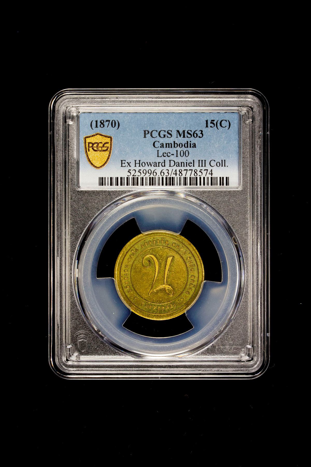 CAMBODIA: Norodom I, 1860-1904, 15 centimes token, ND, Lec-100, brass token struck for the Royal Palace in Phnom Penh, Latinized Khmer text, somdach prea norodom prea chau grung campuchea around central Khmer letter, denomination on reverse, a lovely mint state example! PCGS graded MS63, ex Howard Daniel III Collection. A scarce series of 10, 15, 20, and 25 centimes tokens are noted by H. Rolland in 1932 as "a l'usage du palais (1906)." These tokens were likely struck circa 1875-1904 for circulation inside the Royal Palace.
