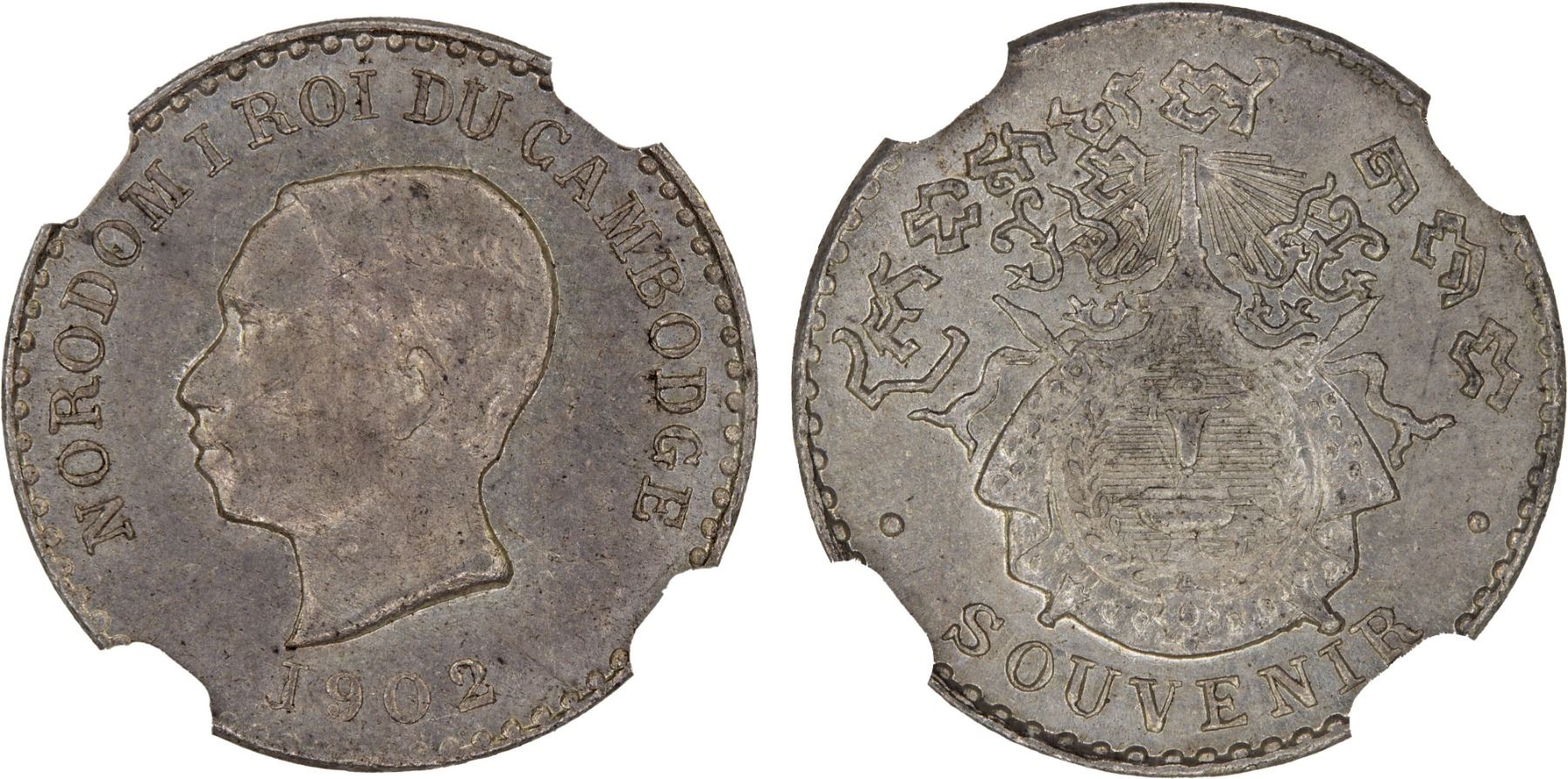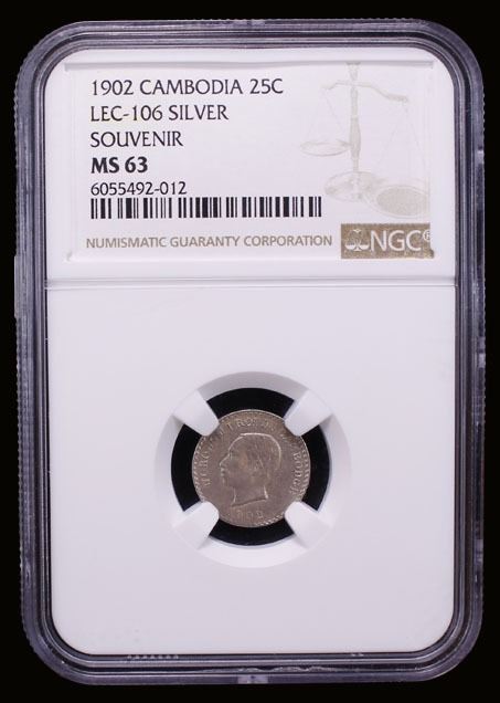 CAMBODIA: Norodom I, 1860-1904, AR 25 centimes, 1902, Lec-106, Gad-106, Daniel-P83g, souvenir issue, mintage of only 250 pieces, rare, satiny luster, NGC graded MS63. Minted and sold at the Hanoi Exposition in 1902-3.