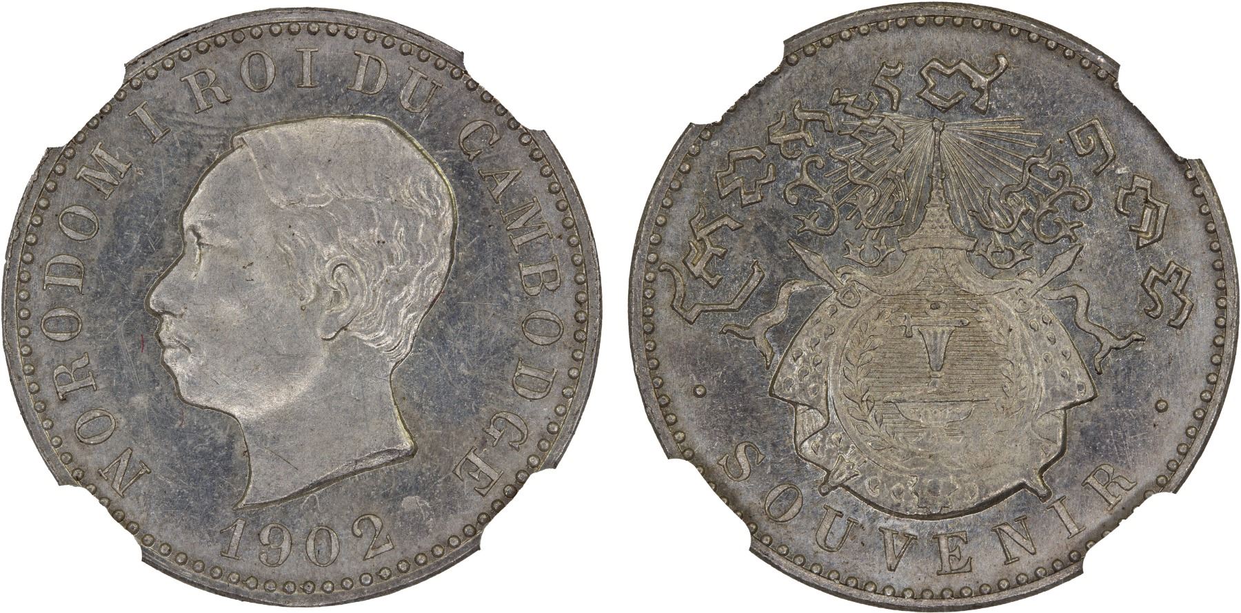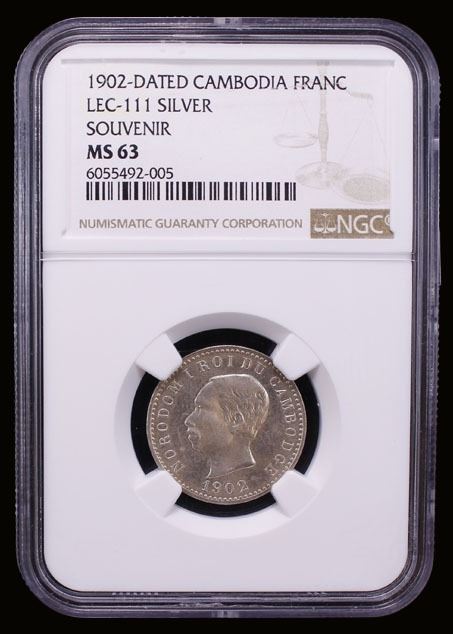 CAMBODIA: Norodom I, 1860-1904, AR franc, 1902, Lec-111, Gad-17, Daniel-P85g, souvenir issue, mintage of only 250 pieces, with lightly frosted devices on prooflike fields, light hairlines, rare, NGC graded MS63. Minted and sold at the Hanoi Exposition in 1902-3.