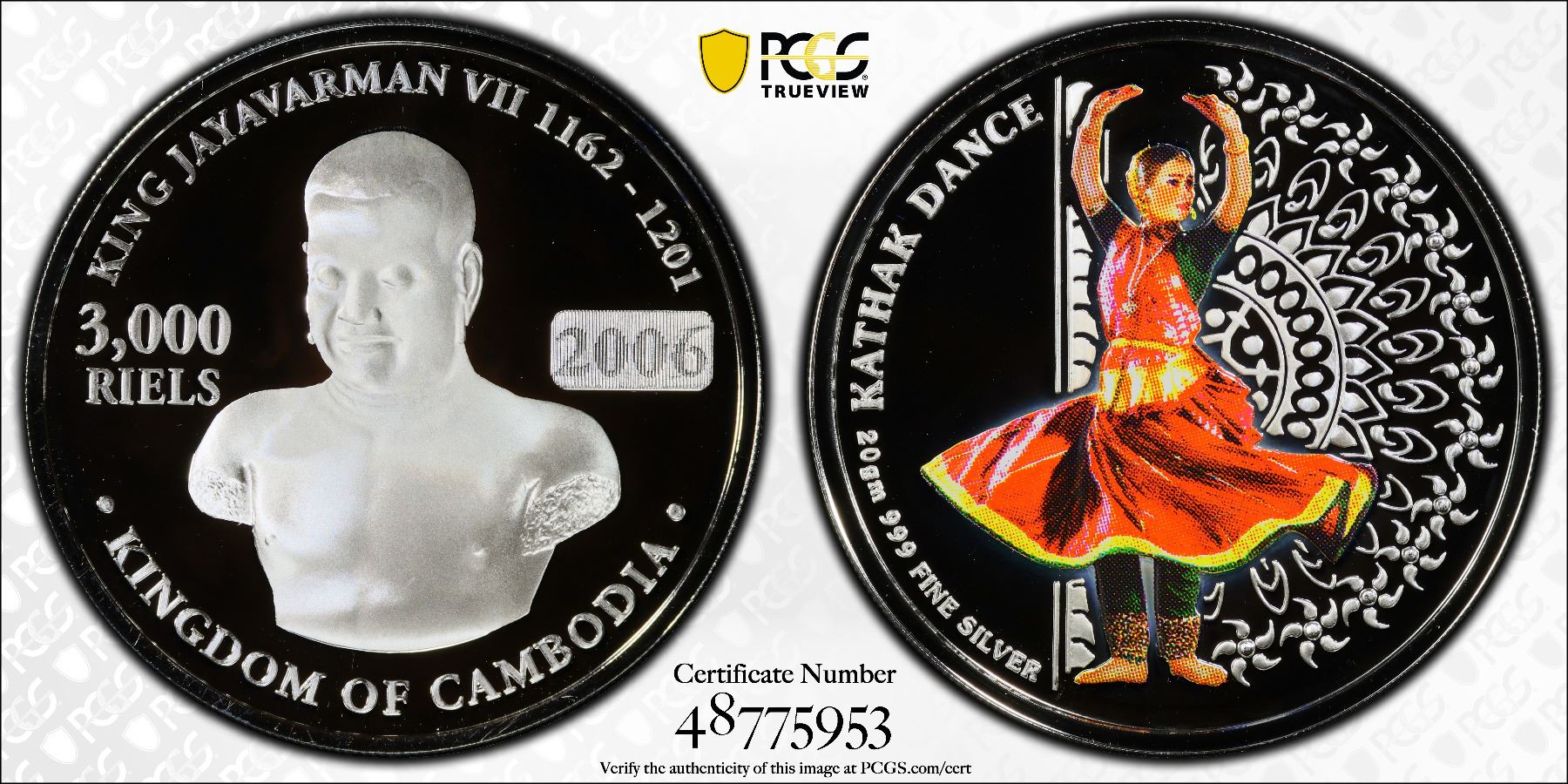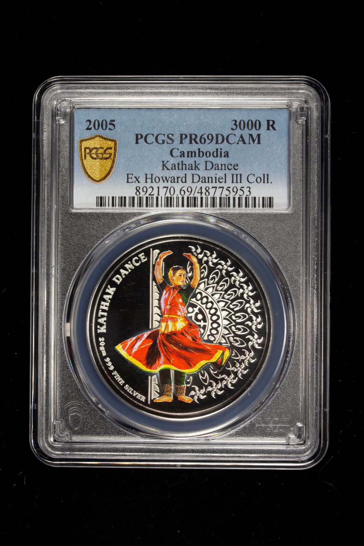 CAMBODIA: Norodom Sihamoni, 2004-, AR 3000 riels, 2005, KM-127, D-CS111, Kathak Dance, multicolored applique, mintage of only 10,000 pieces, PCGS graded Proof 69 DCAM, R3 (Daniel), ex Howard A. Daniel III Collection.