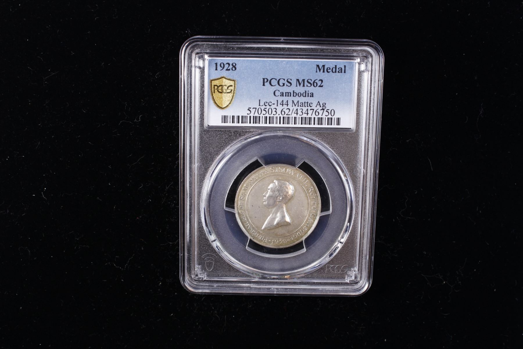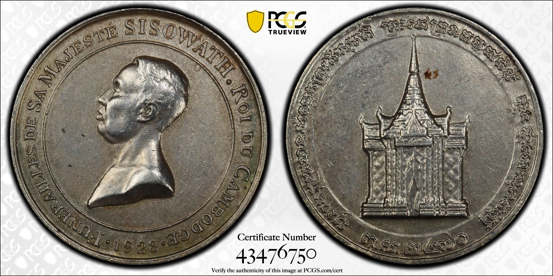 CAMBODIA: Sisowath Monivong, 1927-1941, AR medal, 1928, Lecompte-136, Daniel-M16b, 27mm unsigned silver medal for the Funeral of Sisowath I by P. Lenoir, bust left with "FUNÉRAILLES DE SA MAJESTE SISOWATH ROI DU CAMBODGE - 1928" around // Royal Palace Building for Funerals with Cambodian text around, matte finish, rare, mintage of only 250 pieces, ARGENT and hallmark on edge, label erroneously reads "Lec-144", PCGS graded MS62, ex The Paris Collection.
